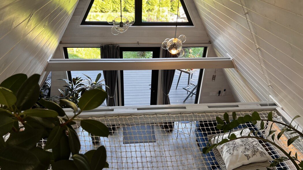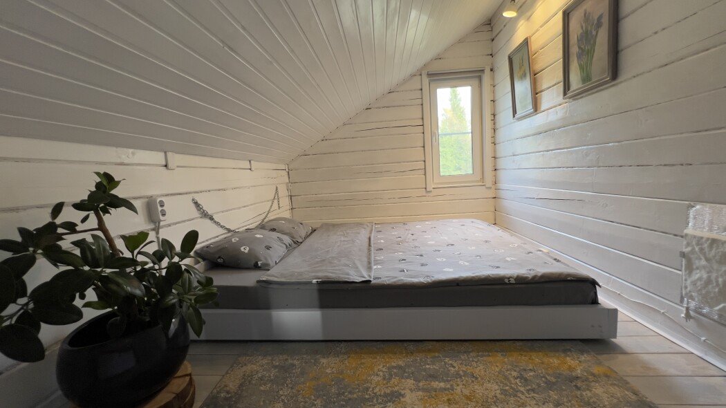 На втором этаже расположена уютная спальня с удобным матрасом (160х200), застеленная качественным красивым бельём. На уютной сетке-лежанке можно проводить время, читая любимую книгу или работая за ноутбуком.