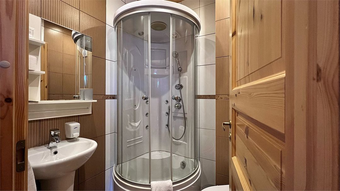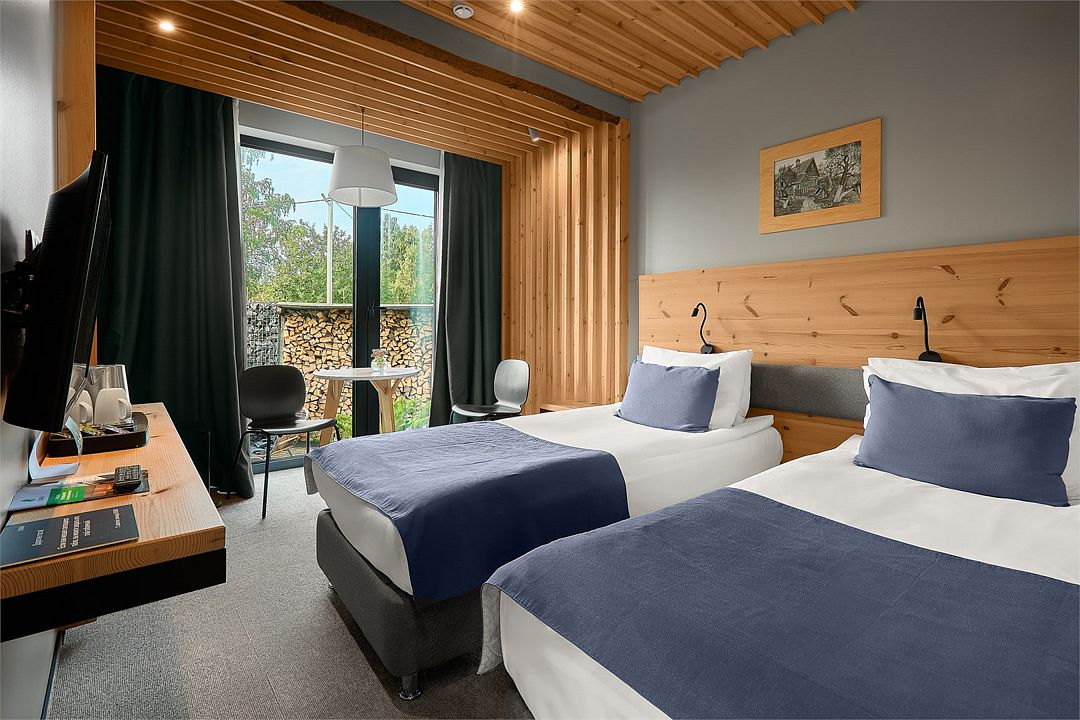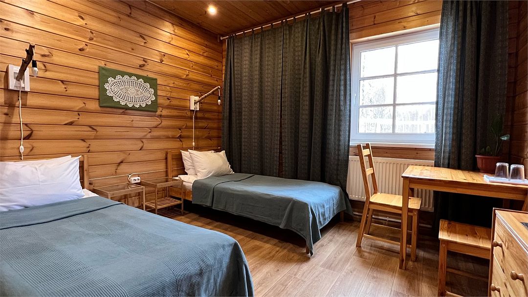 Номер с собственным санузлом, оформленный в деревенском стиле. Две односпальные кровати.
