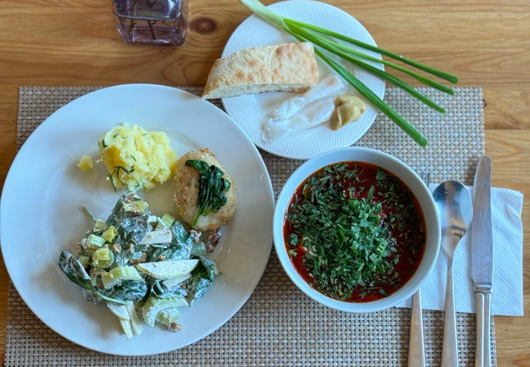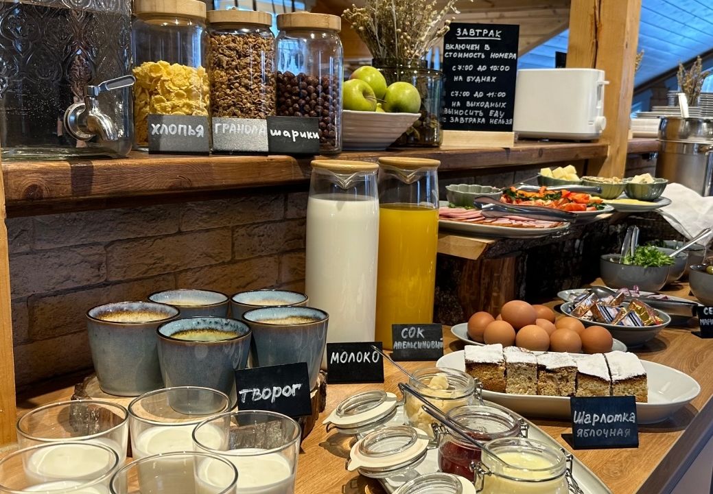 Завтрак, входящий в стоимость проживания, предлагает разнообразные блюда, такие как творог, молоко, сок и яблочную шарлотку. Обед сочетает салаты, супы и горячие блюда, а ужин дополнен изысканными закусками и домашними соленьями из погреба.