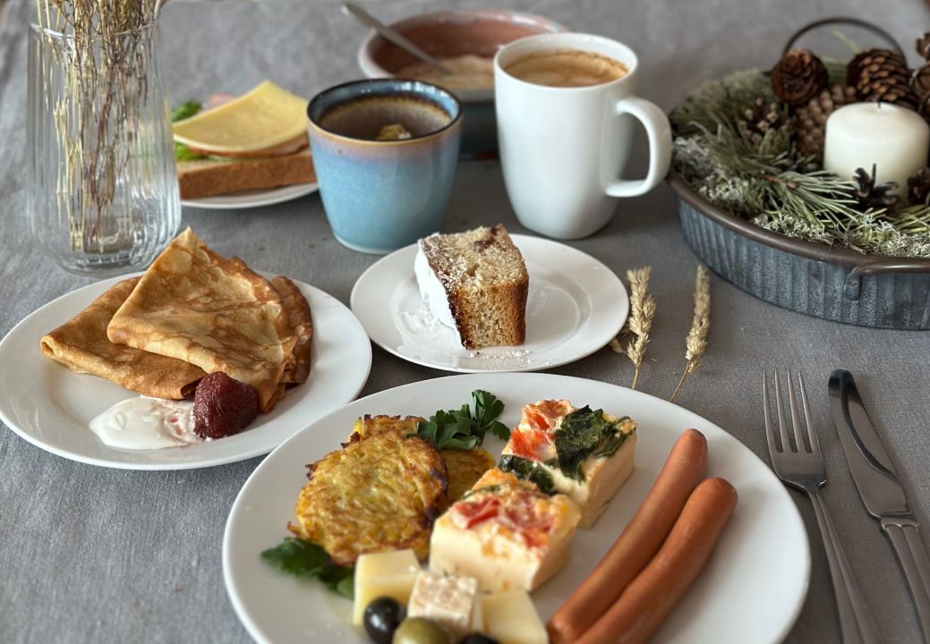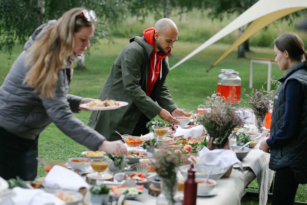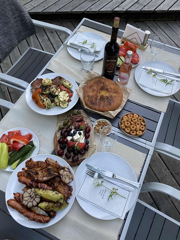 В стоимость номера входит завтрак, также можно заказать обед и ужин по адекватной цене. Готовят вкусно из местных продуктов, на шведском столе всегда всего хватает, даже если приходишь к концу. По субботам на террасе проходит большой летний ужин, который стоит чуть дороже обычного, но он того стоит! Красиво, вкусно, я бы даже сказала, изысканно, несмотря на то, что формат предполагает общий сбор всех гостей за одним столом, как на общей даче. Все знакомятся, общаются, атмосфера чудесная, в основном благодаря хозяевам - Владимиру и Марине, которые, видно, всей душой вкладываются в свое дело. Общение с ними украсило наше пребывание и мой праздник, за что им большое спасибо! Кстати, они планируют расширение территории и открытие спа и уличного бассейна к следующему году, и тогда это место будет абсолютно идеальным. Единственное, что стоит отметить: несмотря на карту, залив находится не так уж близко, и до ближайшего пляжа надо ехать на машине, так что это стоит принять во внимание, если для вас первая линия - это принципиальный вопрос.