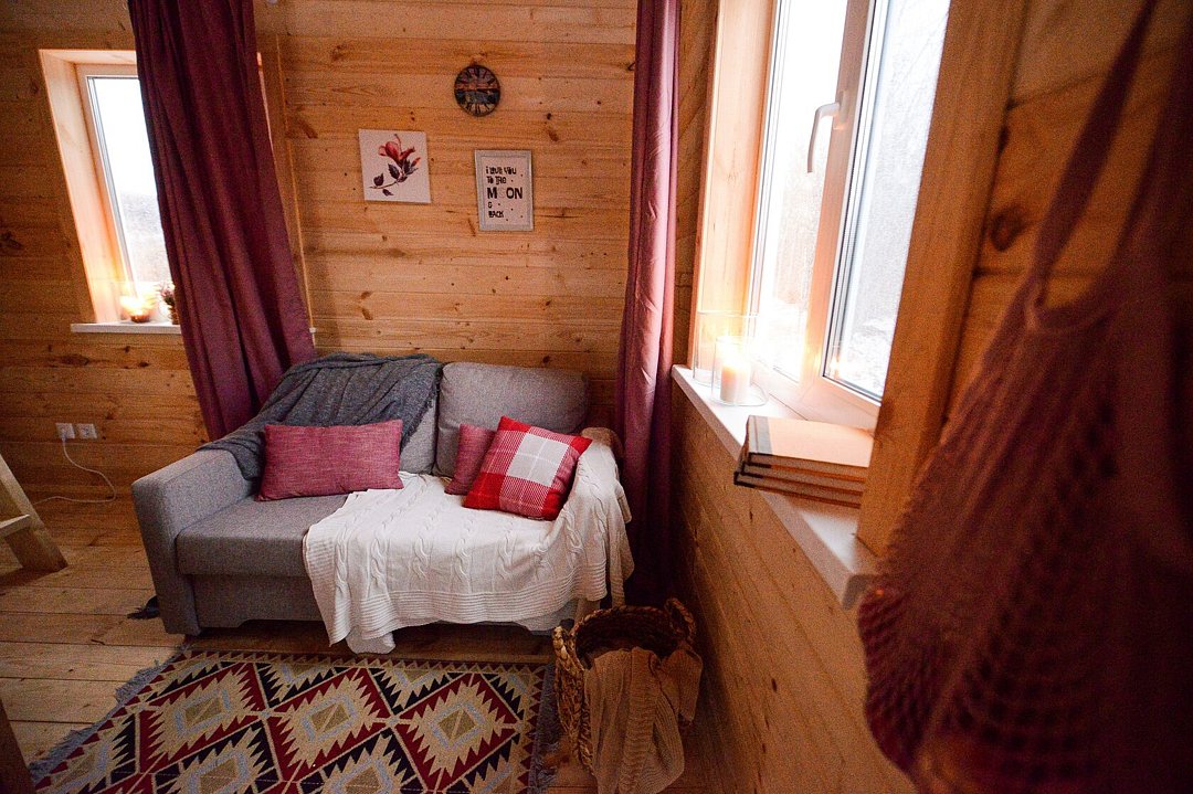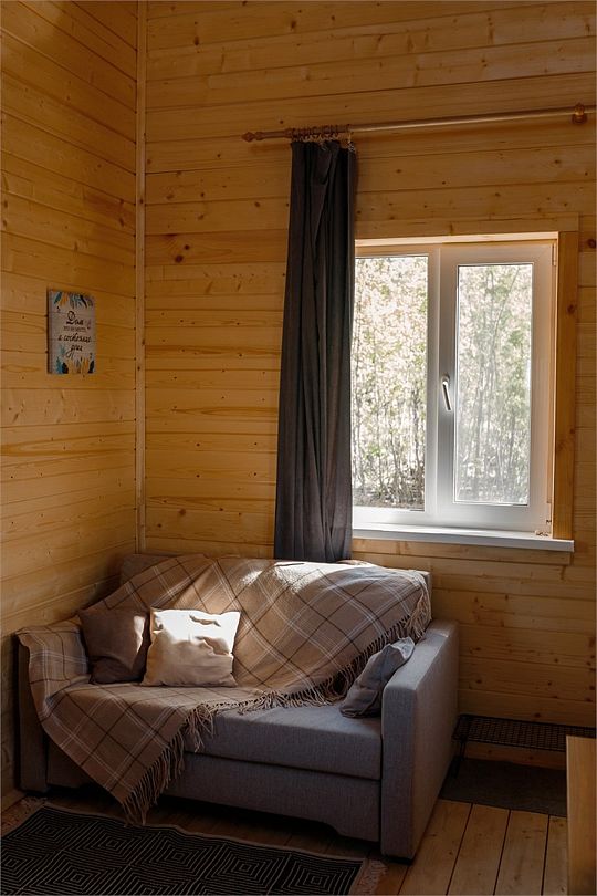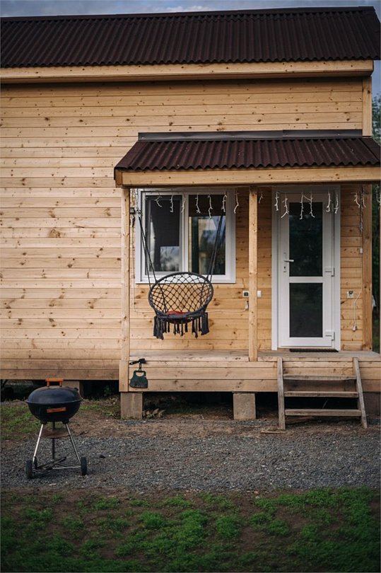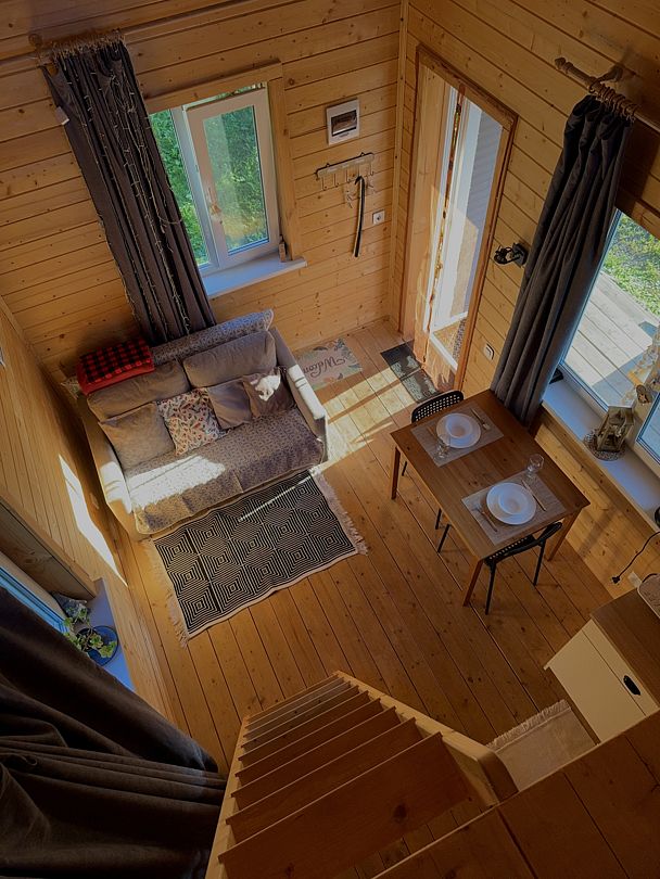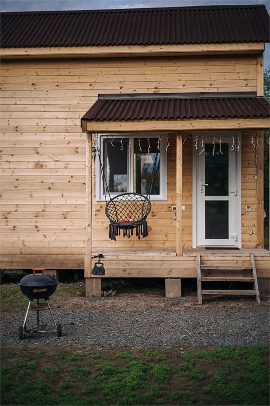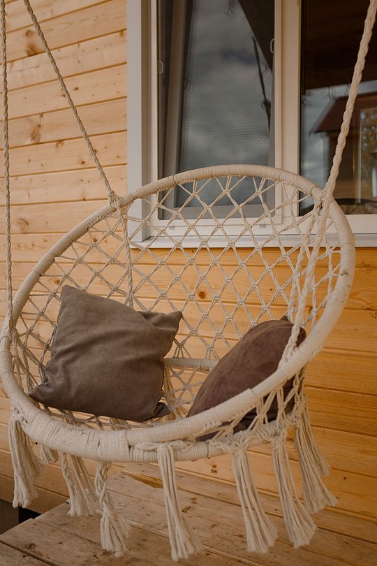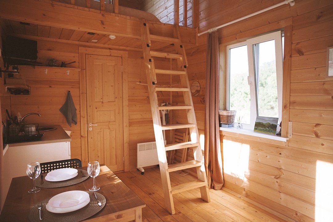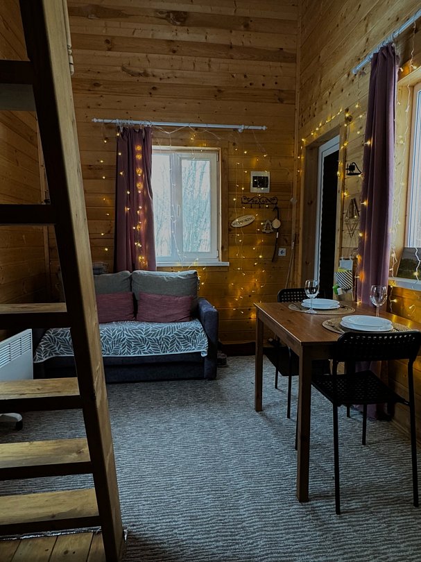 Внутри вас ждет полностью оборудованная кухня, где вы сможете готовить любимые блюда, а индивидуальная зона мангала позволит устроить незабываемый вечер с шашлыками на свежем воздухе. Представьте, как ваша вторая половина наслаждается покоем в подвесном кресле, укутавшись в плед, пока вы готовите сочные овощи и мясо на мангале с живописным видом на природу. На первом этаже расположена раскладной диван, а основное спальное место удобно размещено на втором этаже — идеально для спокойного сна под звуки природы.