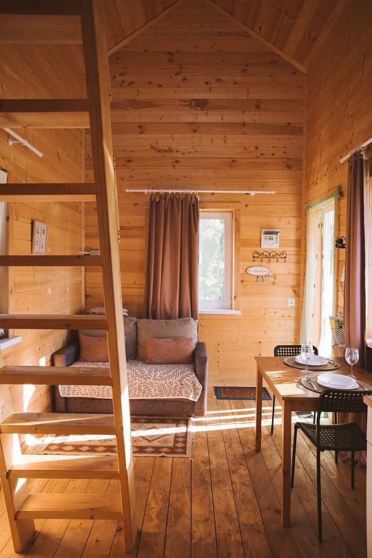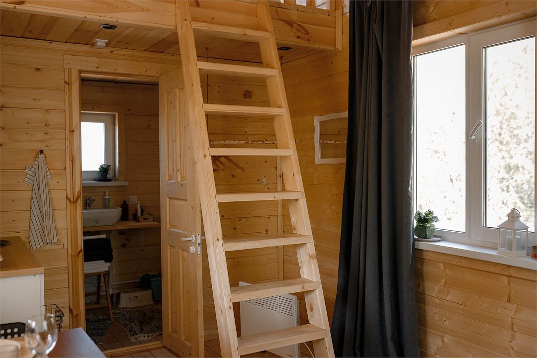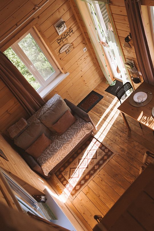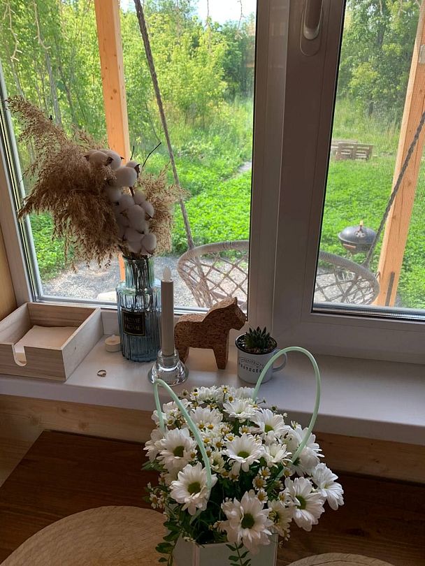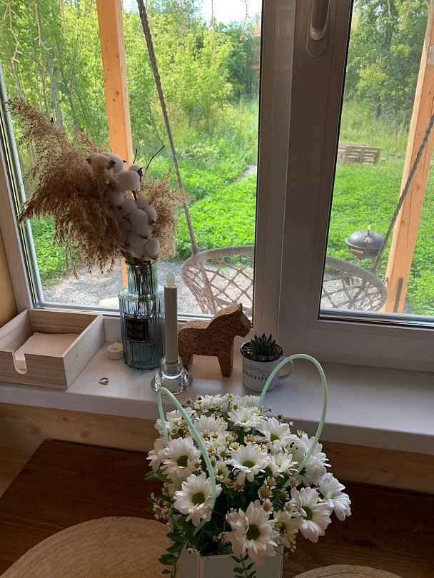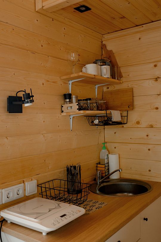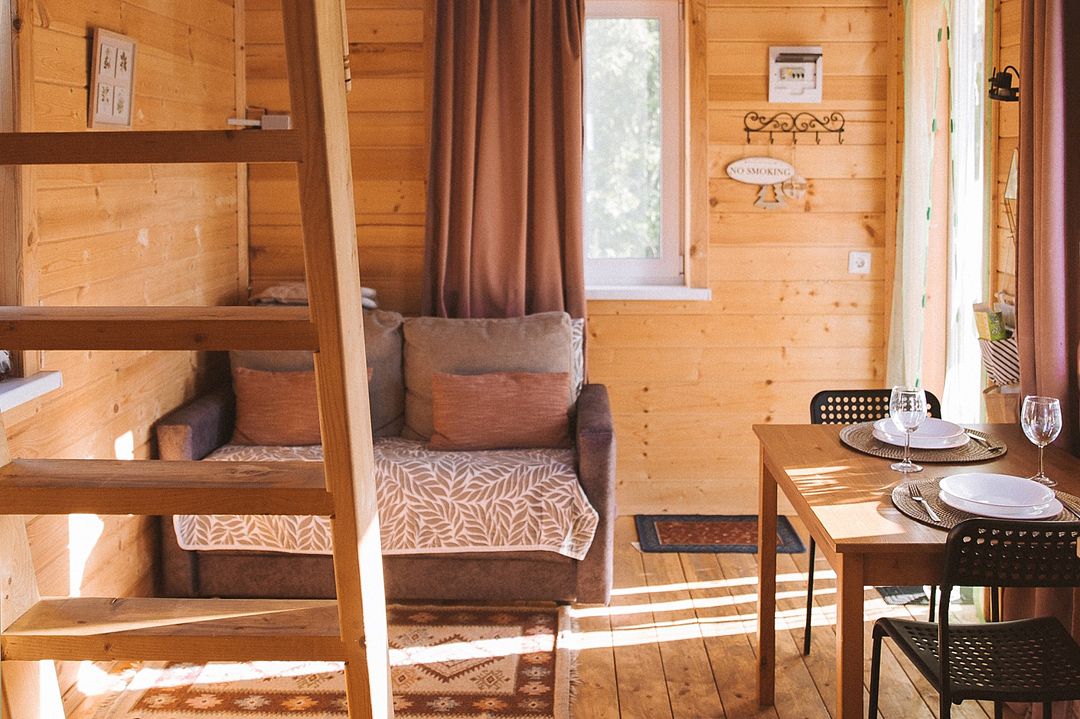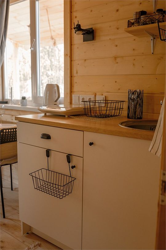 Внутри вас ждет полностью оборудованная кухня, где вы сможете готовить любимые блюда, а индивидуальная зона мангала позволит устроить незабываемый вечер с шашлыками на свежем воздухе. Представьте, как ваша вторая половина наслаждается покоем в подвесном кресле, укутавшись в плед, пока вы готовите сочные овощи и мясо на мангале с живописным видом на природу. На первом этаже расположена раскладной диван, а основное спальное место удобно размещено на втором этаже — идеально для спокойного сна под звуки природы.