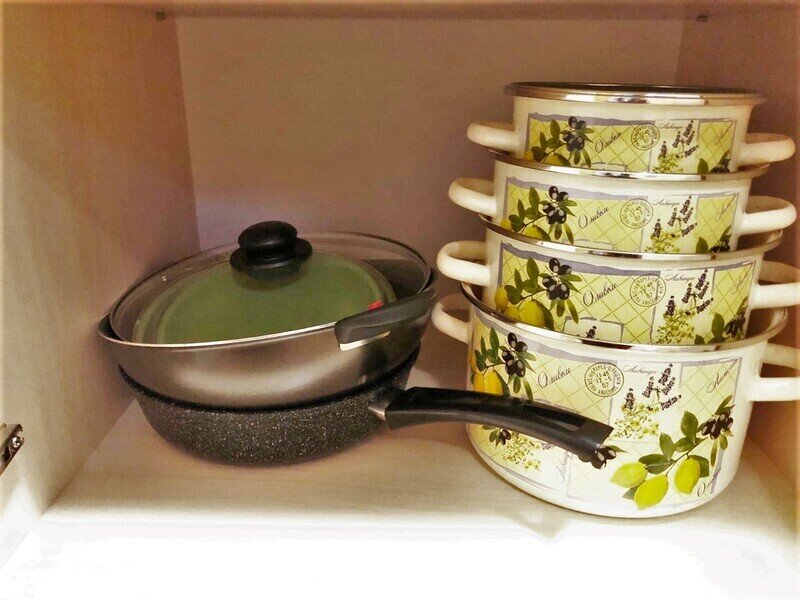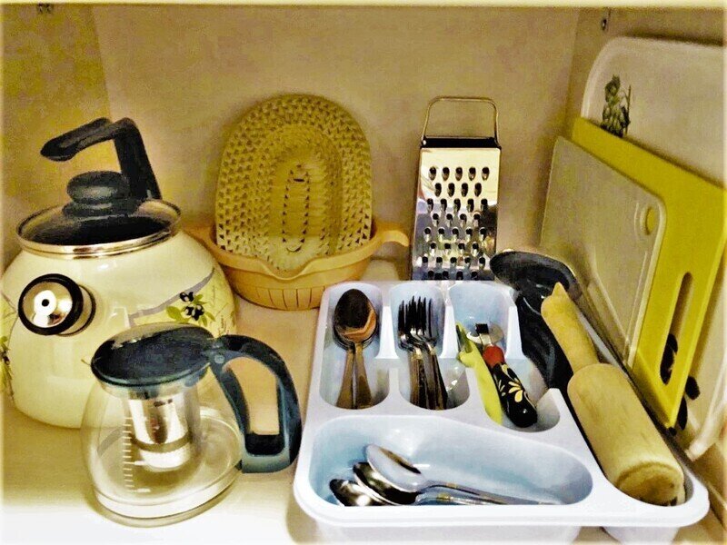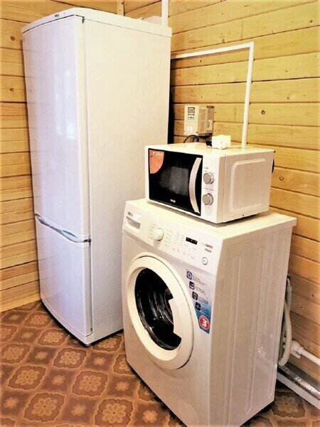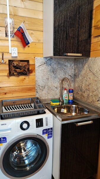 - кухня (холодильник, стиральная машина, микроволновка, газовая плита, кухонный гарнитур, стол со стульями, чайник, турка, полный набор посуды, кран для питьевой воды с дополнительными фильтрами);