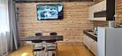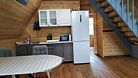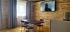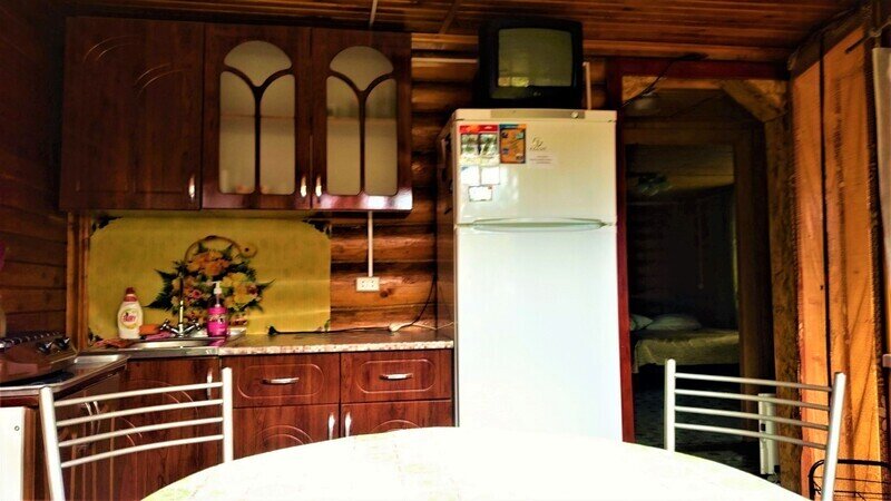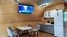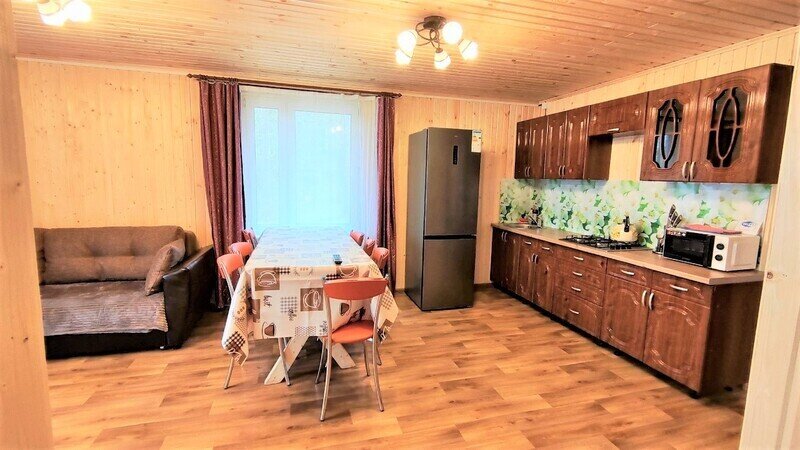 - гостиная (угловой диван, столик, жк-телевизор, обеденный большой стол со стульями, кресло, холодильник, микроволновка, газовая плита, чайник, полный набор посуды, кран для питьевой воды с дополнительными фильтрами);