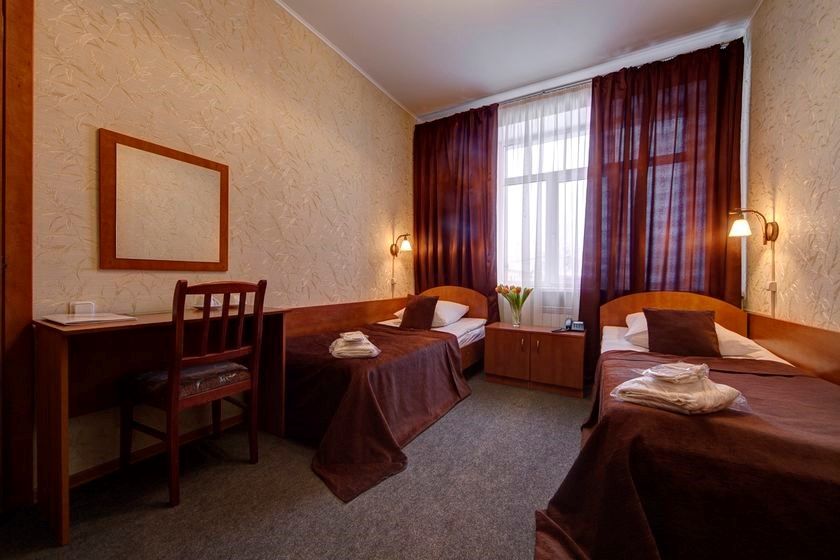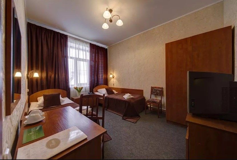 Wi-Fi, тапочки, две односпальные кровати, стулья, шкаф для одежды, унитаз, душ, общая ванная комната, стол, тумба, цифровое тв, внутренний телефон, мини-холодильникВ гостиничном номере