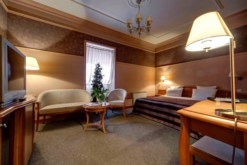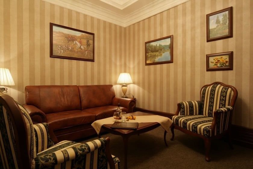 Двухместный номер категории Люкс. Отлично подойдет для новобрачных, поскольку выполнен в классическом стиле с росписью на потолке. Номер оборудован кондиционером, мини-баром, системой теплый пол, а так же гидромассажной ванной. В гостинной расположен кожаный диван и два мягких кресла, чтобы с комфортом провести вечер возле каминаУслуги и удобства