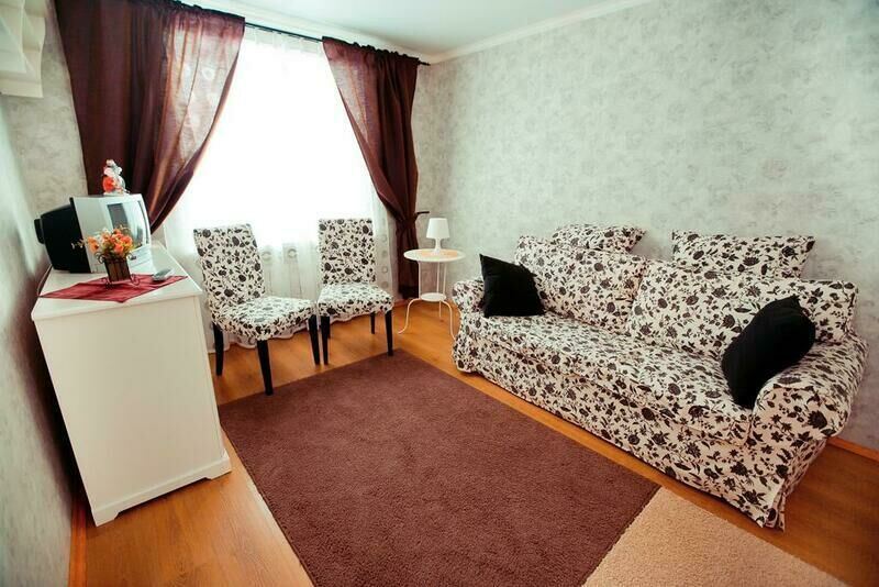 Двухкомнатный номер в основном корпусе - спальная комната с двуспальной кроватью, гостиная комната с мягкой мебелью, телевизором, письменным столом и холодильником.