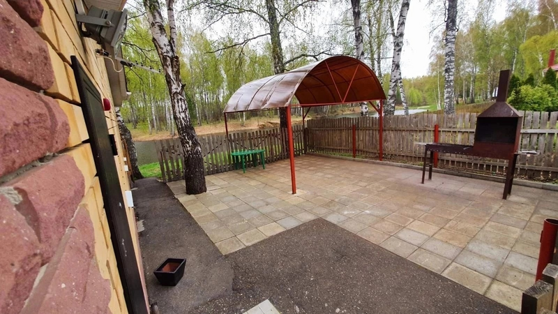 Рядом с домом расположена площадка для барбекю с мангалом, столом и лавками.