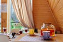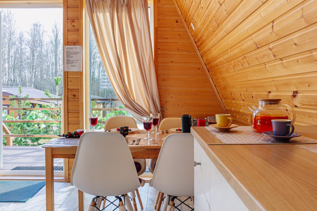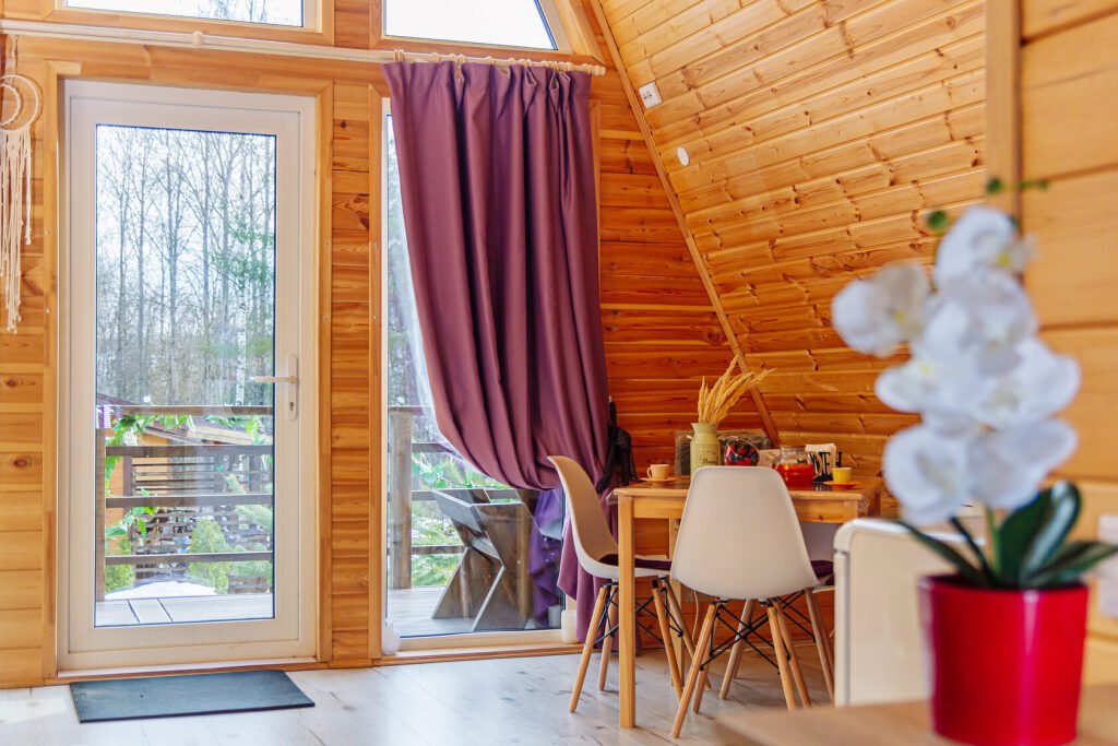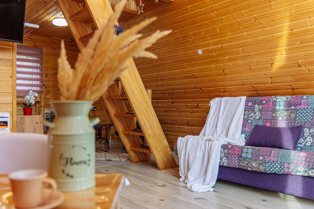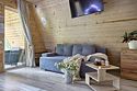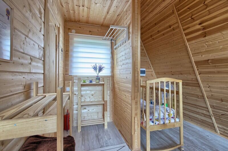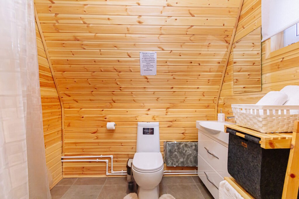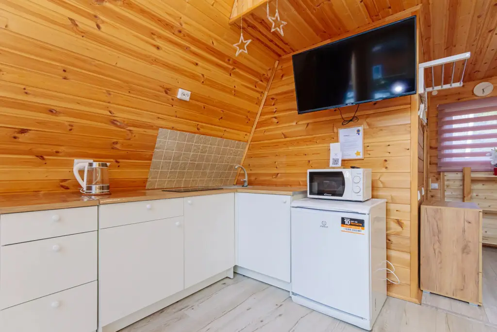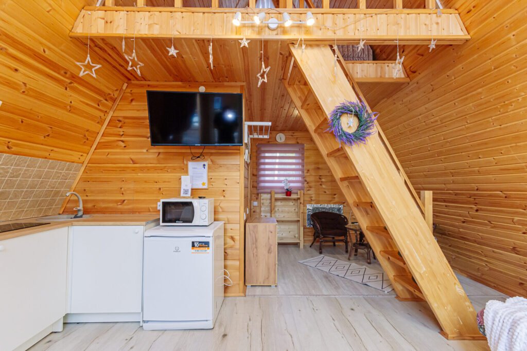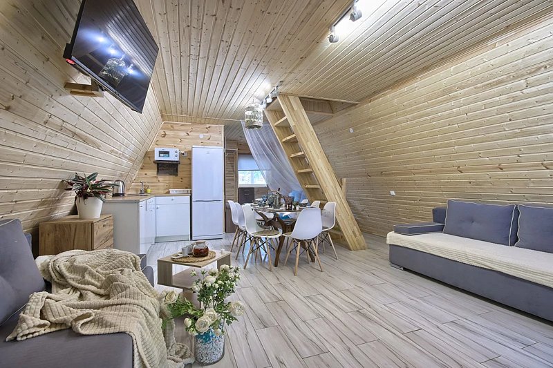 Светлое шале №1. Этот стильный домик шале № 1 , вмещающий до 4 человек, общей площадью 52 кв.м, полностью выполнен из натурального дерева и оборудован всем необходимым для незабываемого отдыха. Насладитесь теплыми полами с регулируемой температурой, дополненных настенным кварцевым обогревателем и кондиционером. Современный экологический септик гарантирует ваш комфорт, а декор ручной работы создает неповторимую атмосферу.