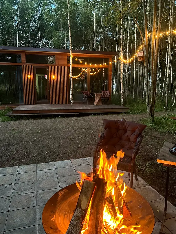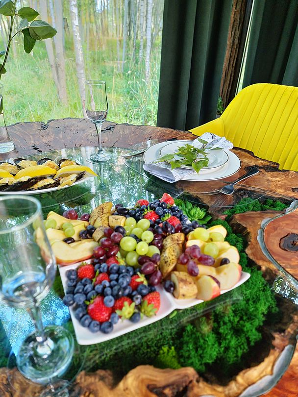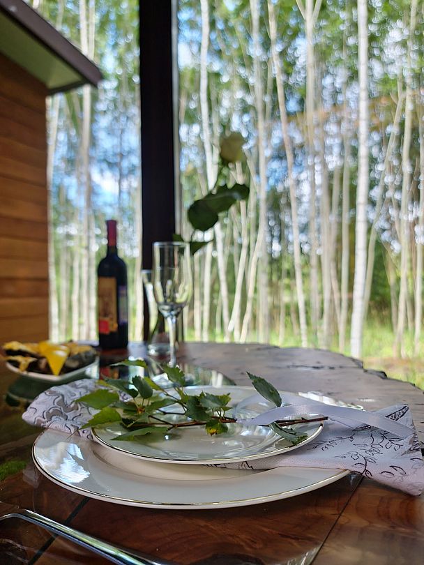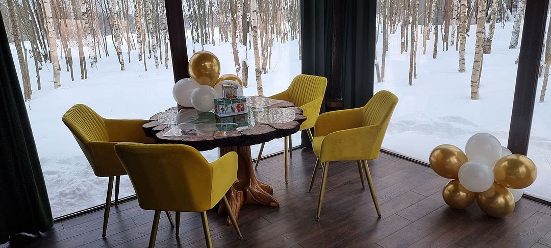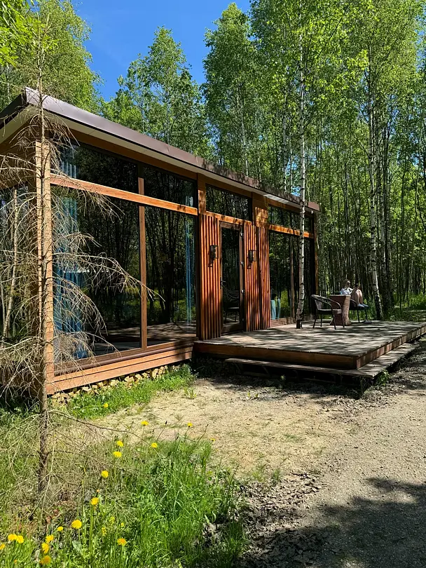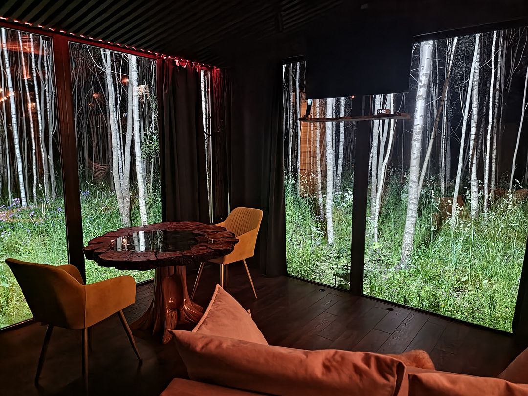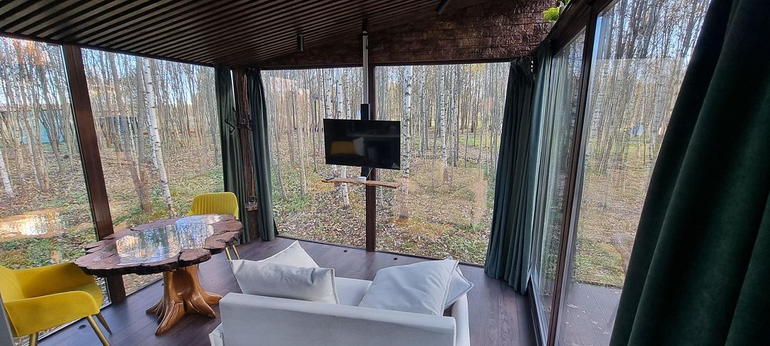 Просторные стеклянные дома, в которых гармонично сочетаются элементы искусства и природы, создают уютную атмосферу, позволяя вам полностью расслабиться и ощутить гармонию с окружающим миром. Отдохните на открытой террасе, завтракайте под звуки природы или устраивайте пикники с мангалом на свежем воздухе, наслаждаясь красотой берез, елей и сосен.