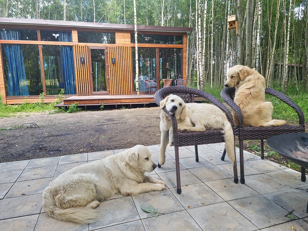 На территории эко-отеля живут золотистые ретриверы — эти «лохматые антидепрессанты» дарят свое внимание и ласку абсолютно бескорыстно, наполняя отдых радостью и теплотой.