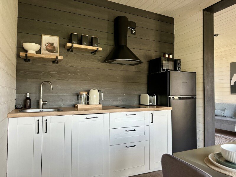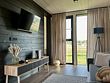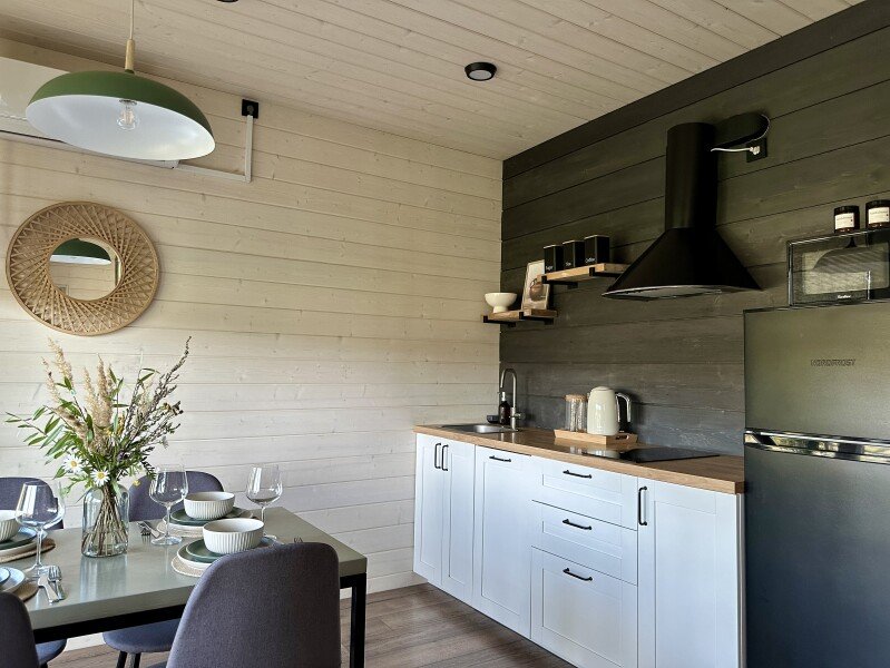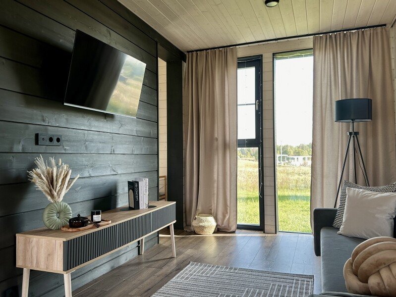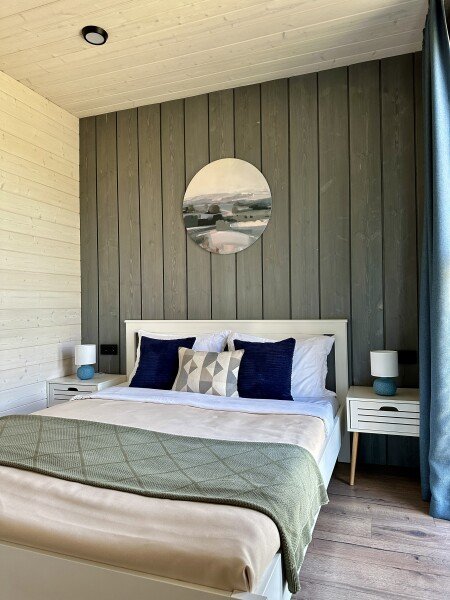 В доме две отдельные спальни: в одной 2-спальная кровать, в другой две 1,5-спальные кровати. В гостиной раскладной диван на 2-х человек. Отдельная зона кухни-столовой и камин для уютных вечеров. Во всех комнатах панорамное остекление. Есть смарт-тв.
