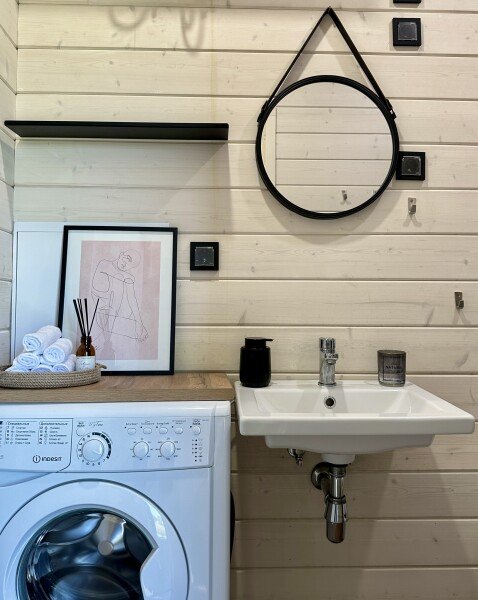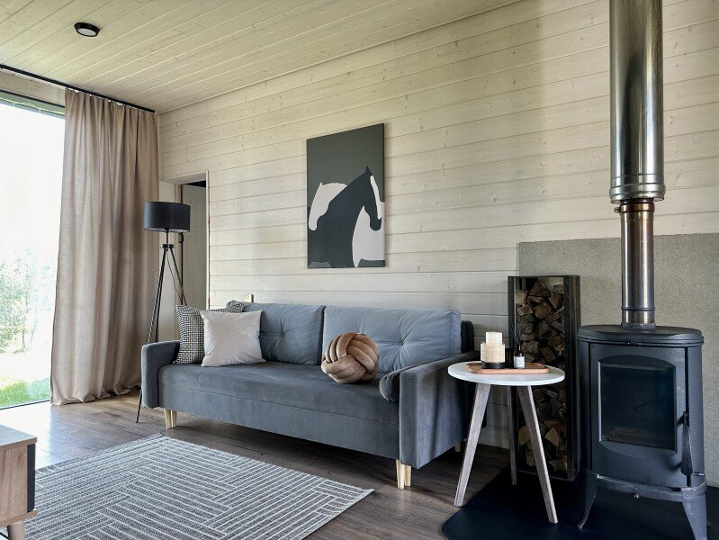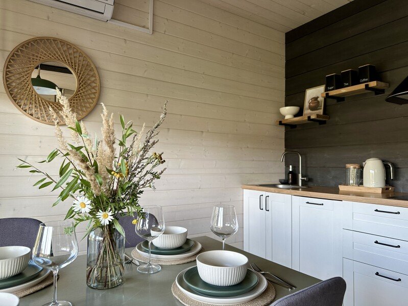 Камин с живым огнём, умная колонка «Алиса», светлый сканди-интерьер с панорамными окнами, веранда с видами на закаты, домик создан для комфортного отдыха. Возможно проживание с собакой. Дом рассчитан на 4–6 человек.