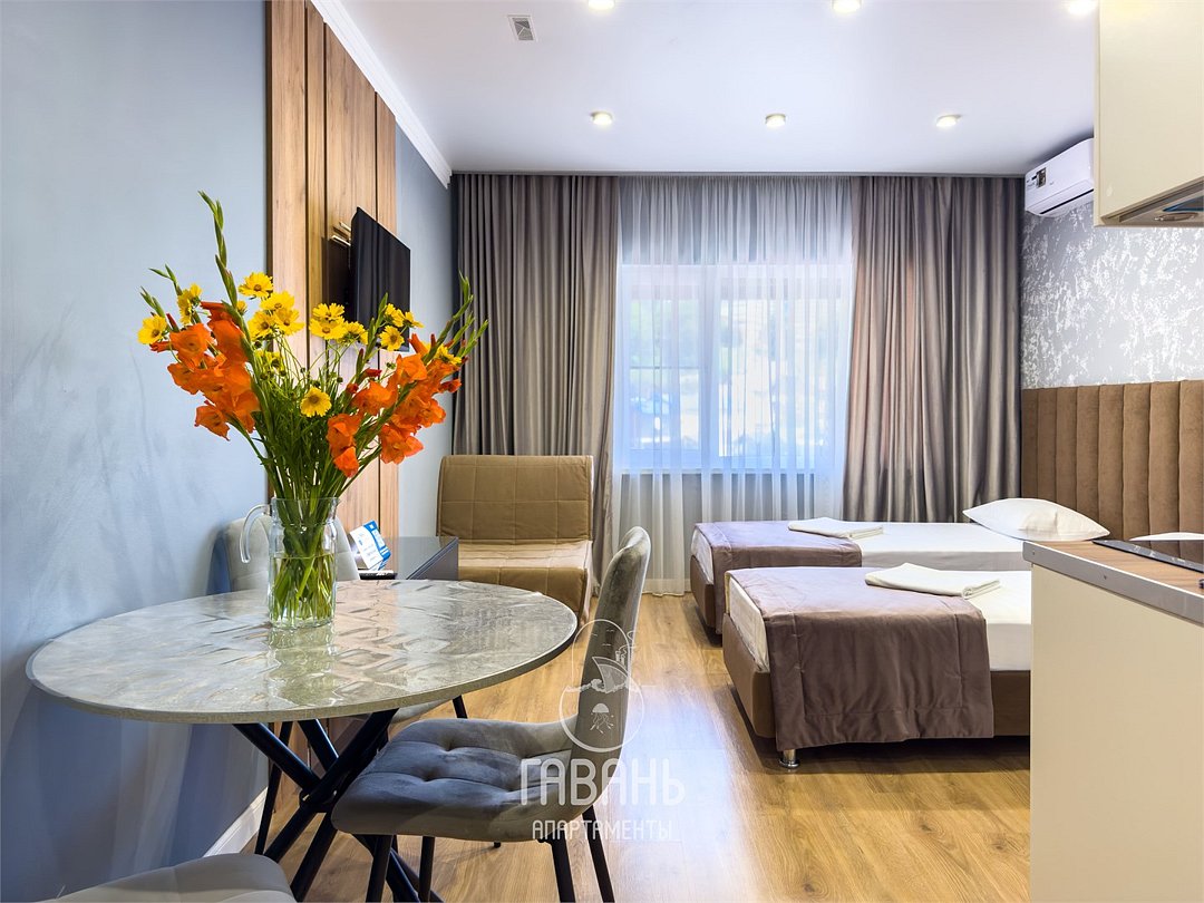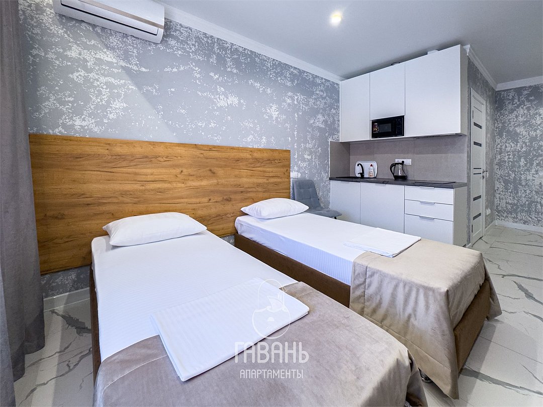 СОВРЕМЕННАЯ, СТИЛЬНАЯ СТУДИЯ КАТЕГОРИИ "КОМФОРТ" С УДОБНОЙ ДВУСПАЛЬНОЙ КРОВАТЬЮ ИЛИ ДВУМЯ ОДНОСПАЛЬНЫМИ КРОВАТЯМИ. ОСНАЩЕНА ВСЕМ НЕОБХОДИМЫМ ДЛЯ КОМФОРТНОГО ПРОЖИВАНИЯ. ВАННАЯ КОМНАТА С ДУШЕВОЙ КАБИНОЙ, СТОЛОВАЯ ЗОНА И УКОМПЛЕКТОВАННАЯ КУХНЯ ОБЕСЕЧИВАЮТ МНОГОФУНКЦИОНАЛЬНОСТЬ. А НЕЙТРАЛЬНЫЕ ТОНА И МИНИМАЛИСТИЧНЫЙ ДИЗАЙН СОЗДАЮТ АТМОСФЕРУ УЮТА И СПОКОЙСТВИЯ.Услуги и удобства