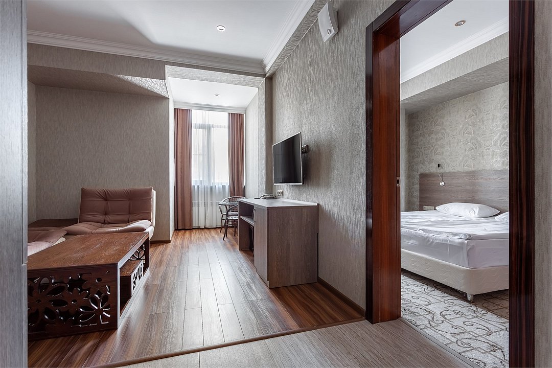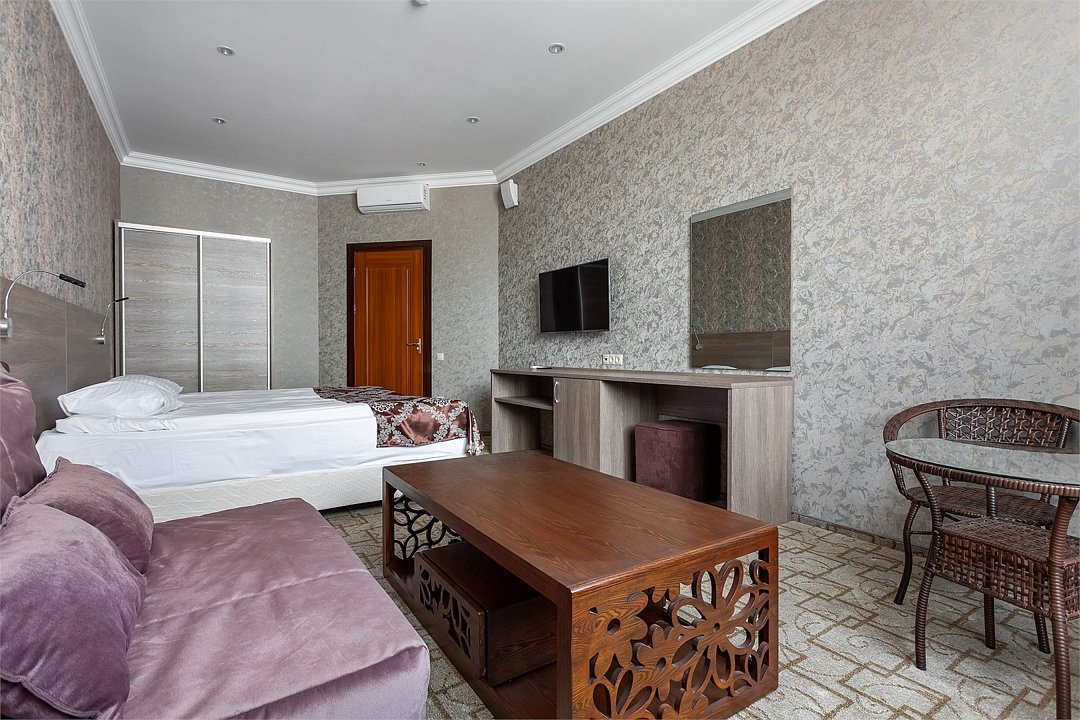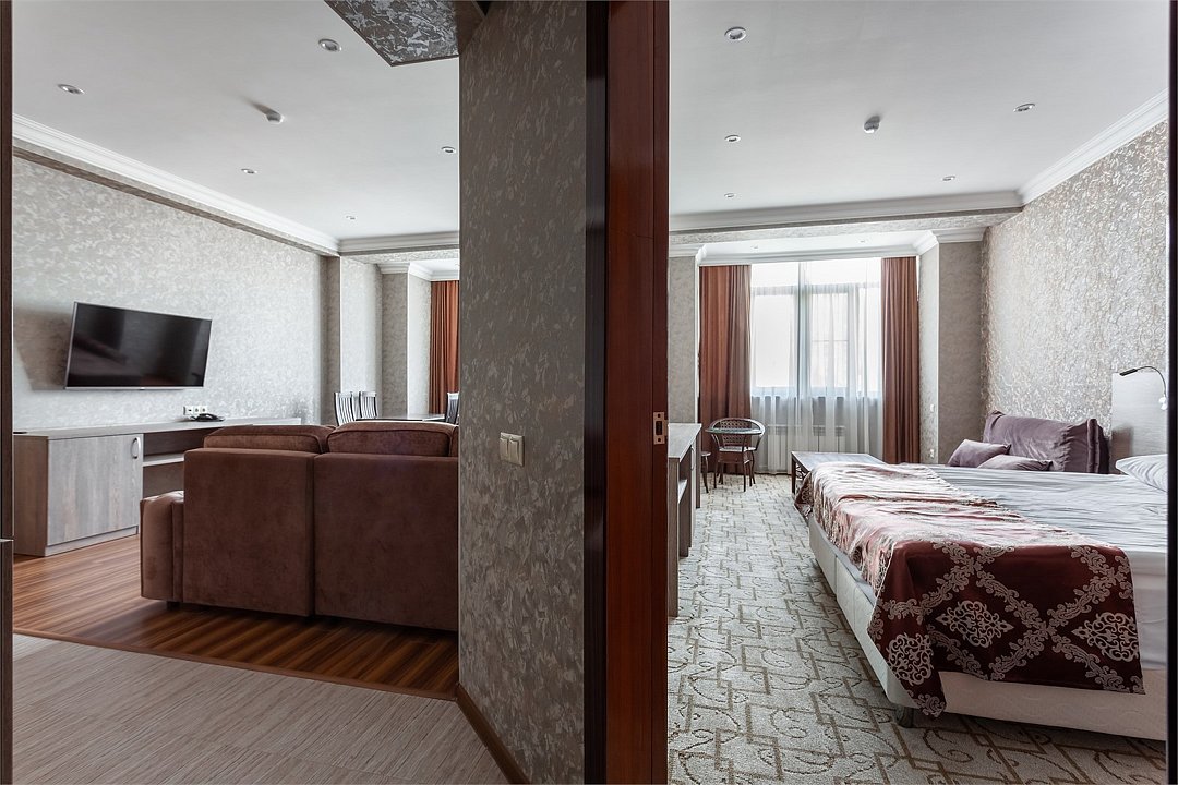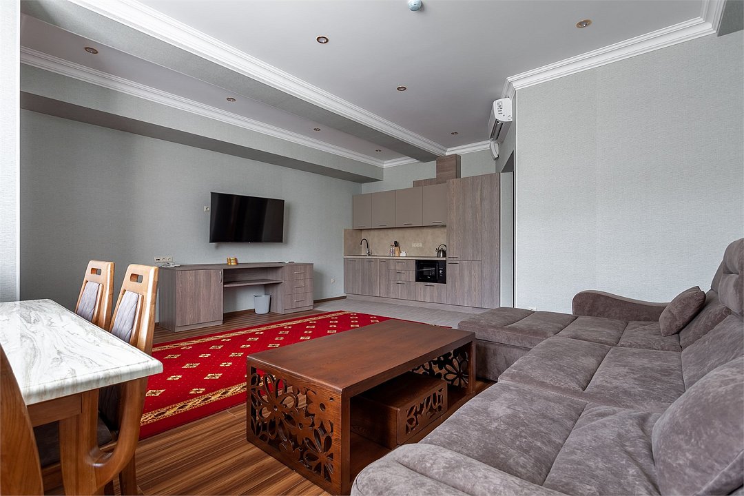 Wi-Fi, интернет, фен, электронные замки, ванная комната, ванна, санузел, биде, банные принадлежности, халаты, банные полотенца, тапочки, косметические средства, односпальная кровать, стулья, шкаф для одежды, гардеробная, вешалки, журнальный столик, стол для переговоров, зеркало, две комнаты, мини-бар, чайный набор, чайник, унитаз, раковина, вид на город, сплит-система, цифровое тв, раскладной диван, внутренний телефон, телевизор с плоским экраном, мини-холодильник, шкаф-купеВ номере