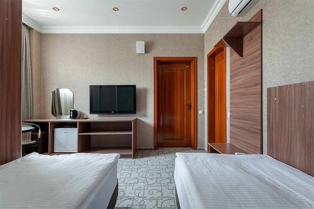 телевизор, Wi-Fi, интернет, телефон, кондиционер, светильник, фен, электронные замки, душевая кабина, санузел, банные принадлежности, банные полотенца, тапочки, две односпальные или большая двуспальная кровать, стулья, шкаф для одежды, гардеробная, вешалки, журнальный столик, письменный стол, зеркало, унитаз, раковина, душ, вид на город, вид во двор, стул, стол, тумба, туалетные средства, туалет, сплит-система, панорамные окна, цифровое тв, раскладное кресло, внутренний телефон, телевизор с плоским экраном, мини-холодильник, шкаф-купе, гостиничная парфюмерияВ номере