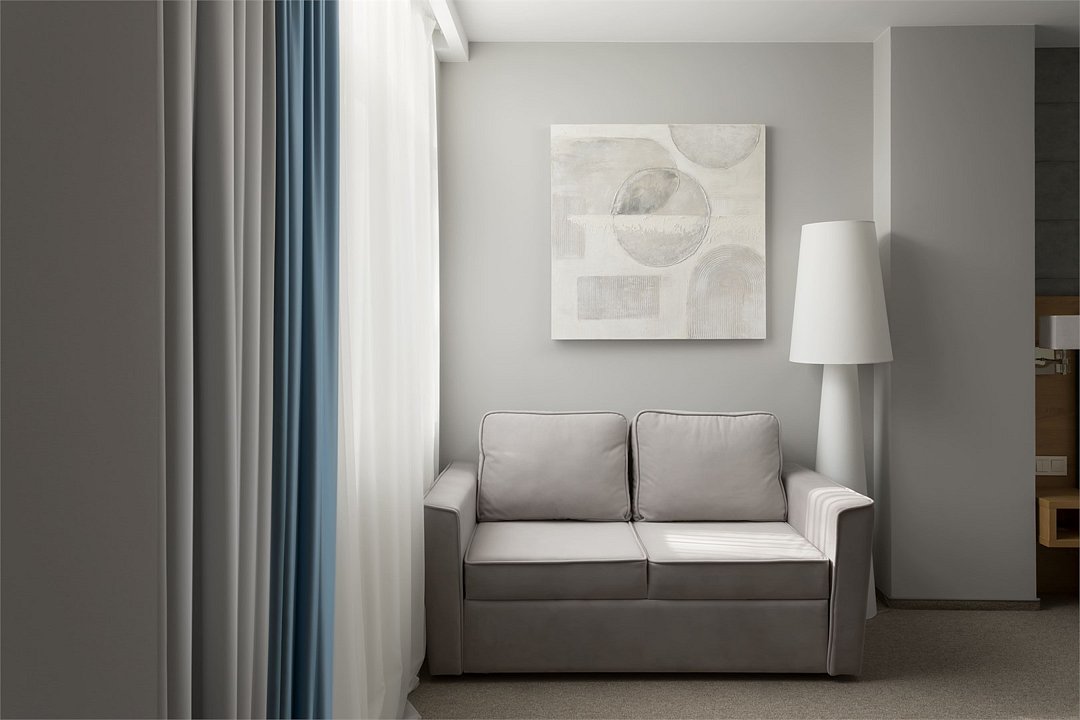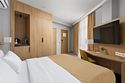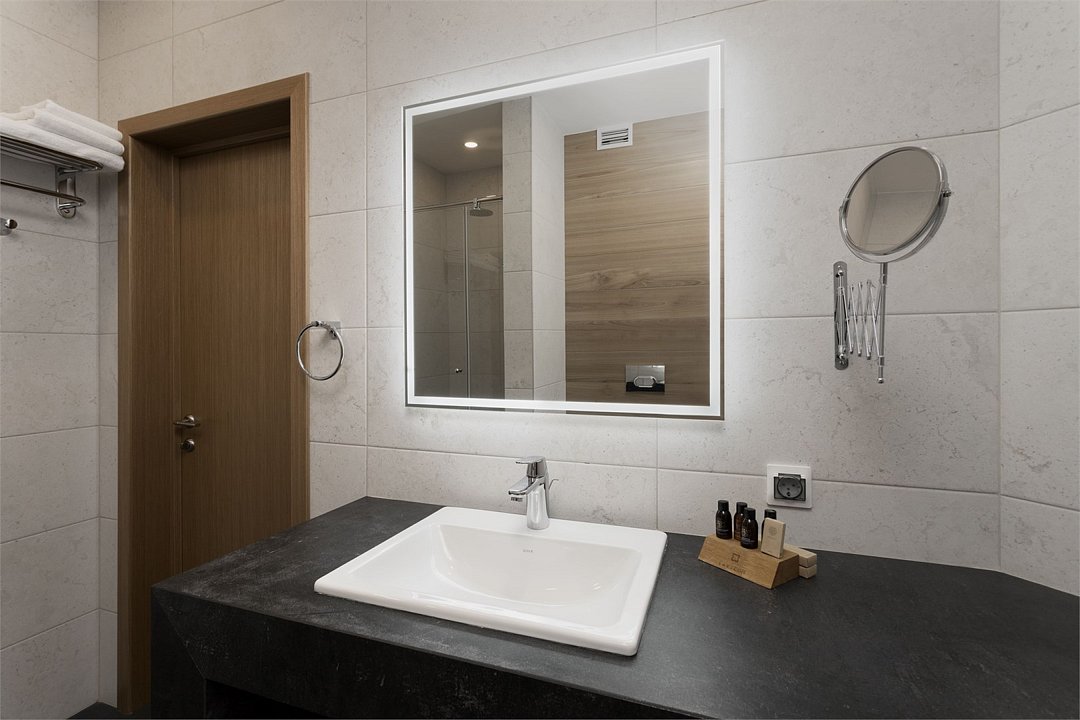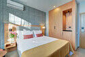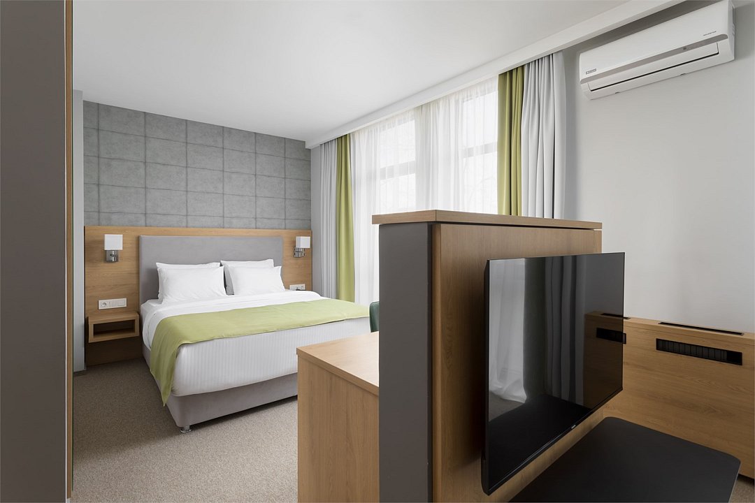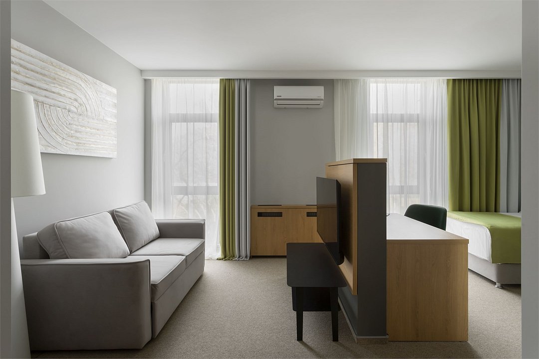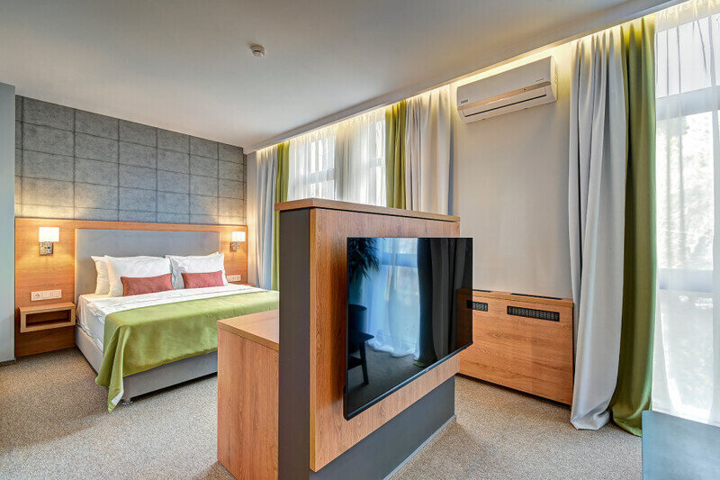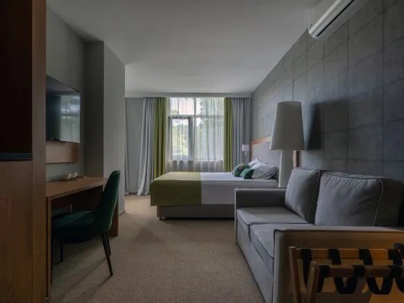 Просторный номер, разделенный на две зоны для размещения одного, двух, трех или четырех гостей. Одна двуспальная кровать с ортопедическим матрасом, качественным постельным бельем, удобными подушками и одеялами, диван-кровать. Прикроватные тумбочки, шкаф, ТВ, холодильник, гладильные принадлежности, кондиционер. Санузел оснащен душем. Косметические принадлежности, набор полотенец.