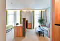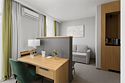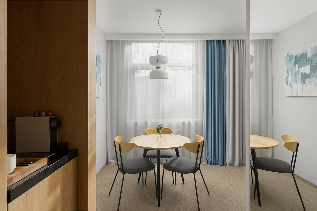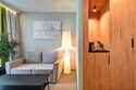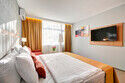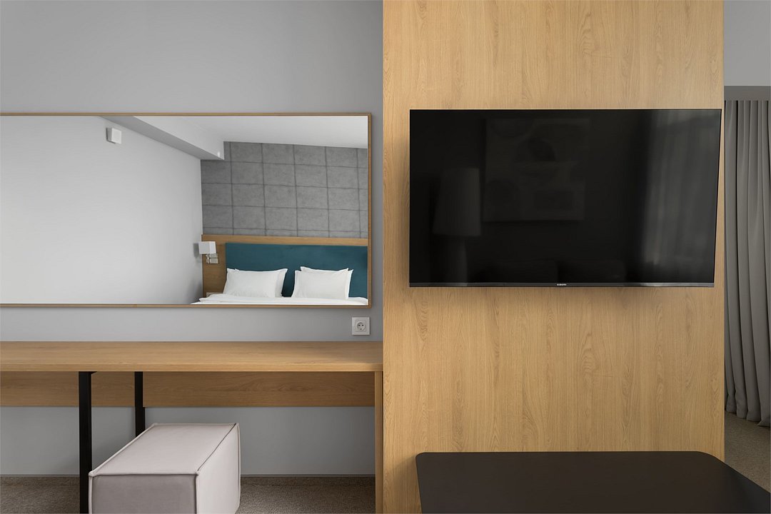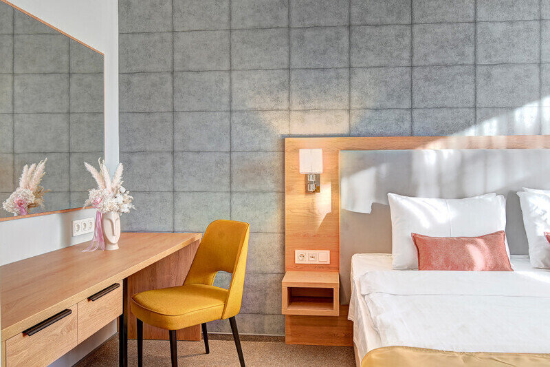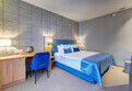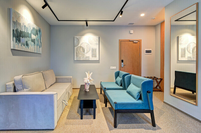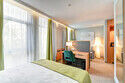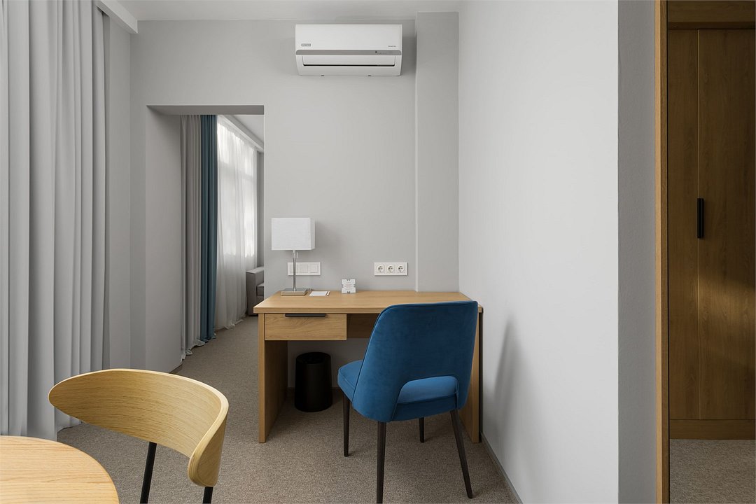 Просторный номер, разделенный на две зоны для размещения одного, двух, трех или четырех гостей. Одна двуспальная кровать с ортопедическим матрасом, качественным постельным бельем, удобными подушками и одеялами, диван-кровать. Прикроватные тумбочки, шкаф, ТВ, холодильник, гладильные принадлежности, кондиционер. Санузел оснащен душем. Косметические принадлежности, набор полотенец.