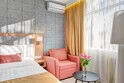 Уютный светлый номер для размещения одного, двух или трех гостей. Одна двуспальная кровать с ортопедическим матрасом, качественным постельным бельем, удобными подушками и одеялами, кресло-кровать. Прикроватные тумбочки, шкаф, ТВ, холодильник, гладильные принадлежности, кондиционер. Санузел оснащен душем. Косметические принадлежности, набор полотенец.