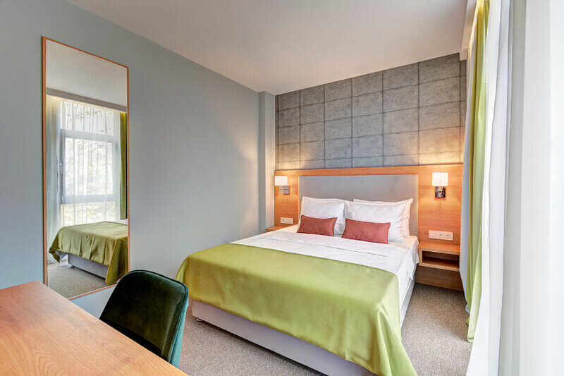 Уютный светлый номер для размещения одного или двух гостей. Одна двуспальная кровать с ортопедическим матрасом, качественным постельным бельем, удобными подушками и одеялами. Прикроватные тумбочки, шкаф, ТВ, холодильник, гладильные принадлежности, кондиционер. Санузел оснащен душем. Косметические принадлежности, набор полотенец