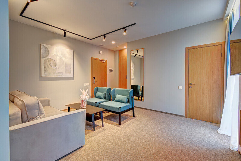 Просторный двухкомнатный номер для размещения одного, двух, трех или четырех гостей. Одна двуспальная кровать с ортопедическим матрасом, качественным постельным бельем, удобными подушками и одеялами, диван-кровать, кресла. Прикроватные тумбочки, шкаф, ТВ, холодильник, гладильные принадлежности, кондиционер. Санузел оснащен душем. Косметические принадлежности, набор полотенец