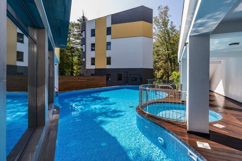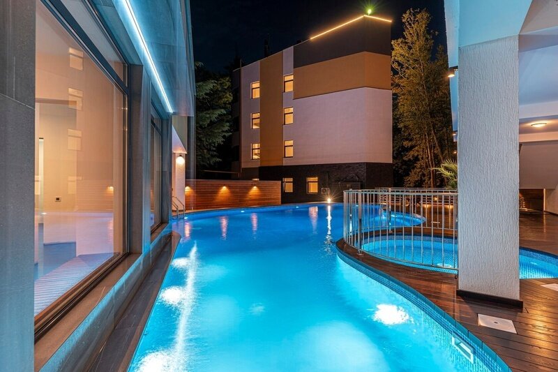 Роскошный подогреваемый бассейн под открытым небом, окруженный уютными лежаками и бесплатными полотенцами, является идеальным местом для отдыха и релаксации. Стильный бар, предлагающий широкий выбор напитков и закусок, дополняет атмосферу гостеприимства и комфорта.
