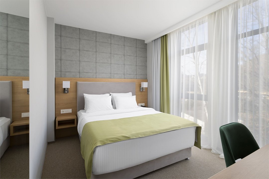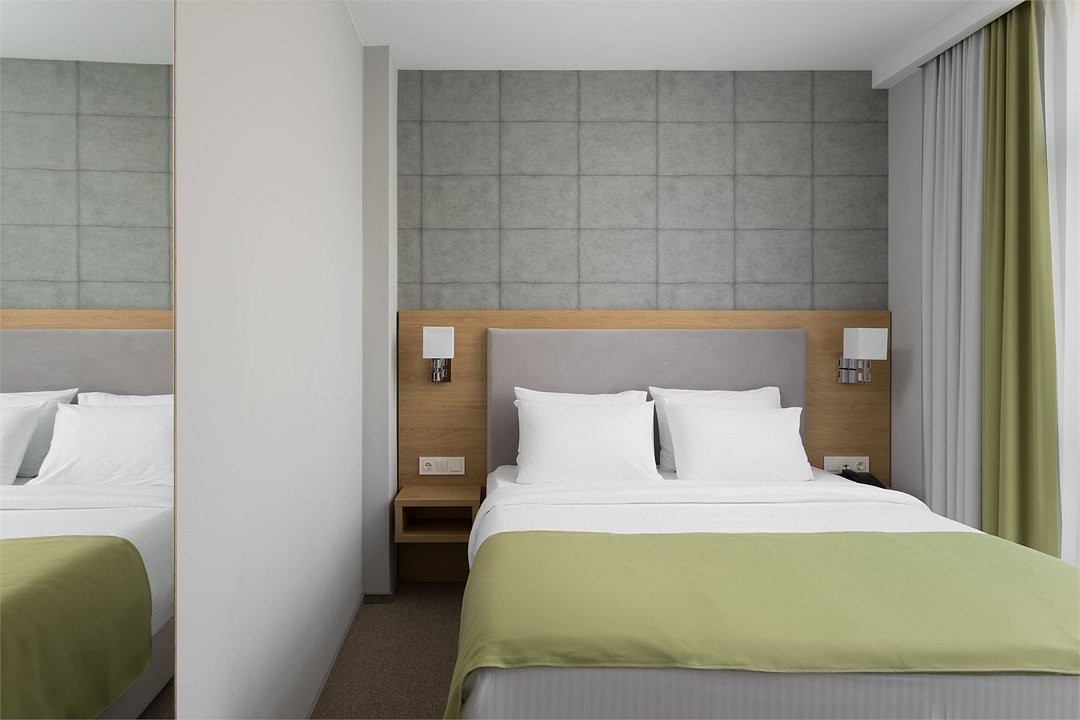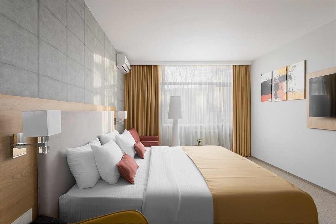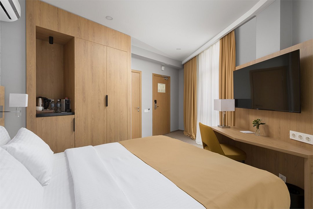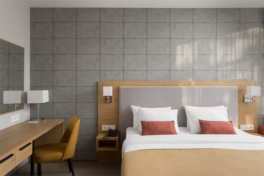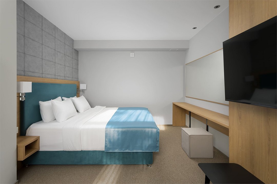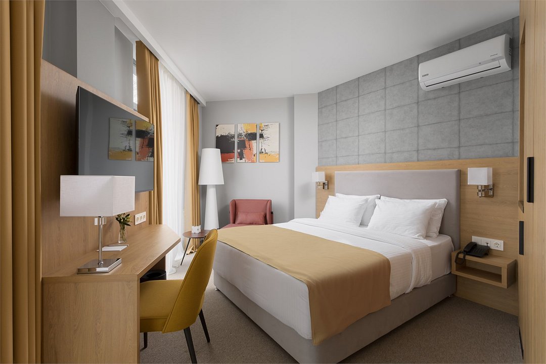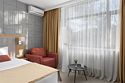Стандартный номер повышенной комфортности площадью 26 кв.м. Номер для комфортного размещения двух-трех человек. В номере расположена одна двуспальная кровать, кресло-кровать. Имеются прикроватные тумбочки, шкаф, ТВ, мини холодильник, гладильные принадлежности, кондиционер, сейф, фен, чайная станция, кофе машина. Санузел оснащен душем, косметическими принадлежностями, набором полотенец, халатами, тапочками. Возможна установка детской кроватки.Услуги и удобства