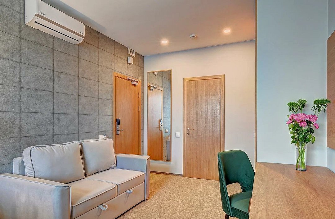 Полулюкс повышенной комфортности площадью 30 м2 для комфортного размещения двух - трех человек. В номере две односпальные кровати (без возможности соединения) и раскладной диван. Имеются прикроватные тумбочки, шкаф, ТВ, мини холодильник, гладильные принадлежности, кондиционер, сейф, фен, чайная станция, кофе машина. Санузел оснащен душем, косметическими принадлежностями, набором полотенец, халатами, тапочками. Возможна установка детской кроватки.Услуги и удобства