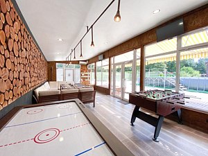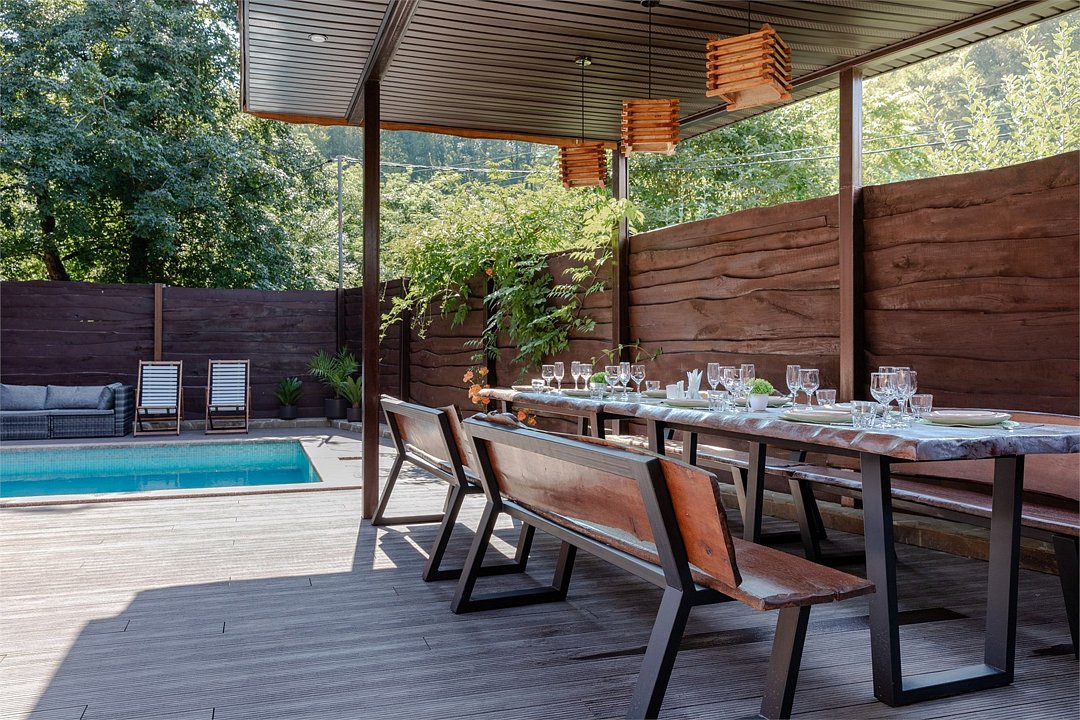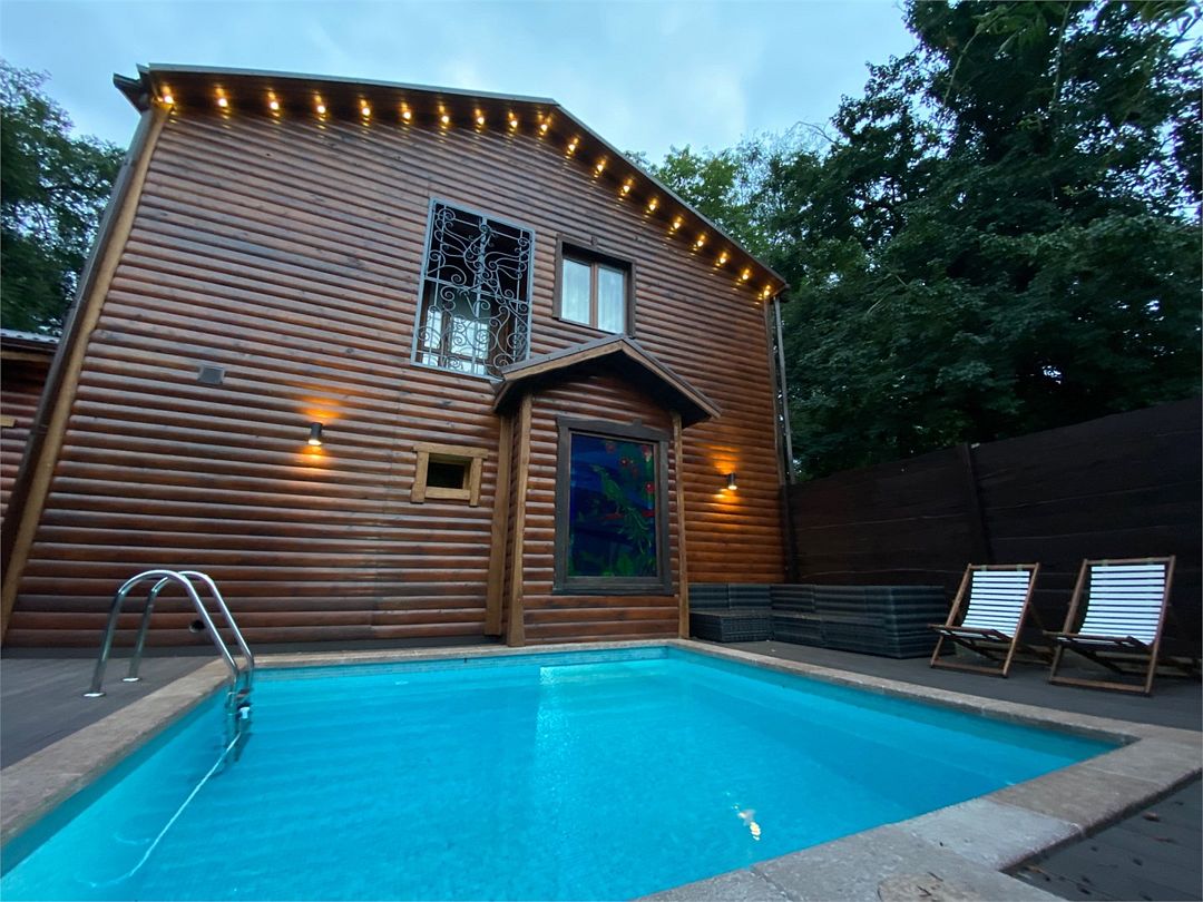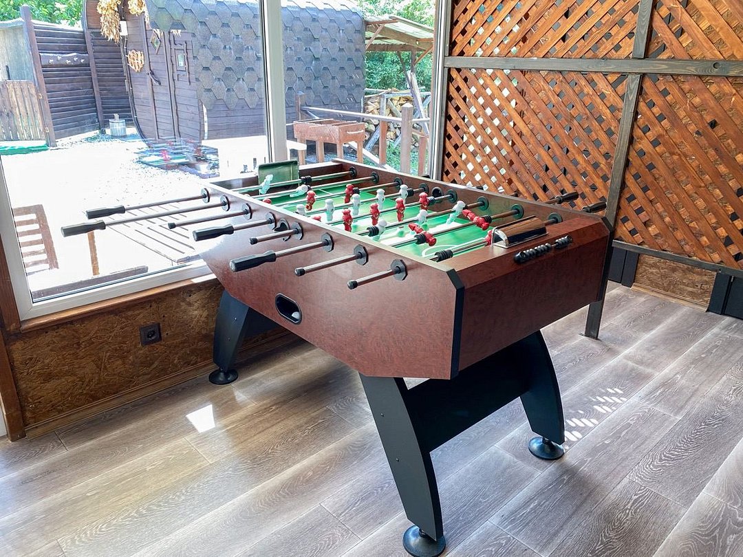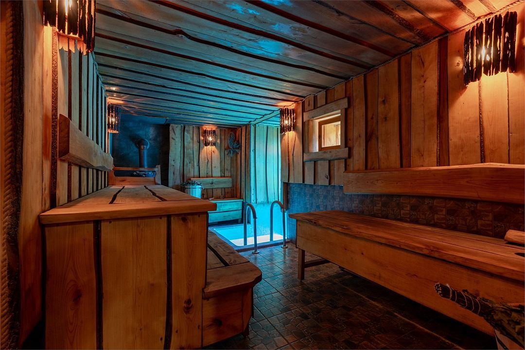 Индивидуальный комплекс со своим бассейном для большой компании. Традиционная русская баня на дровах, кондиционированный и теплый зал отдыха - большой стол для трапезы, аэрохоккей, настольный футбол (кикер), раздевалка, раковина, душевая, туалет. На открытой площадке - зона отдыха со столами, мангал, лежаки, бассейн с фильтрацией.