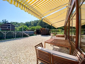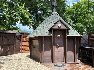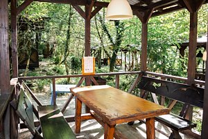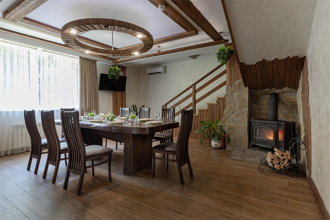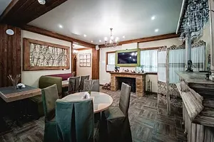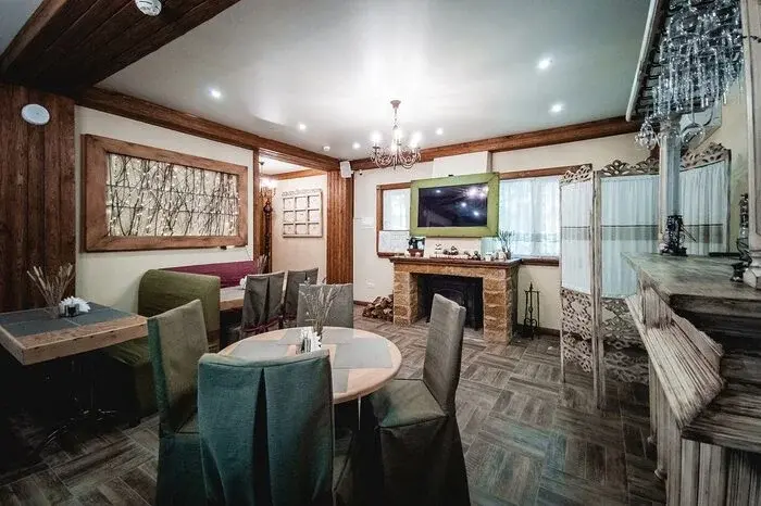 Отдельный зал со своим входом. Имеется электрокамин, ТВ, сплит-система, холодильник, индивидуальный санузел, микроволновая печь, мебель из массива дерева. Предоставляется мангал.