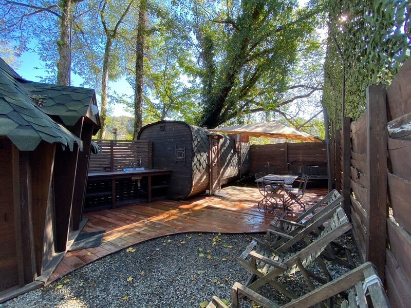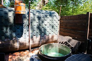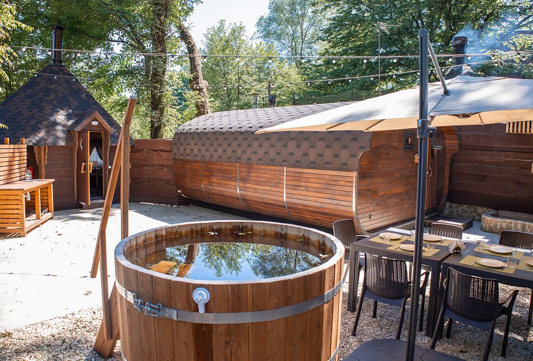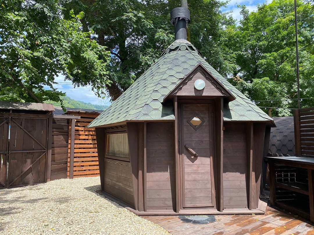 Индивидуальный банный комплекс с видом на горы для небольших компаний. Традиционная русская баня на дровах. Комната отдыха – комфортный домик, аквазона – холодная купель. Открытая терраса с шезлонгами и зонтом.