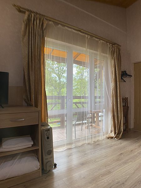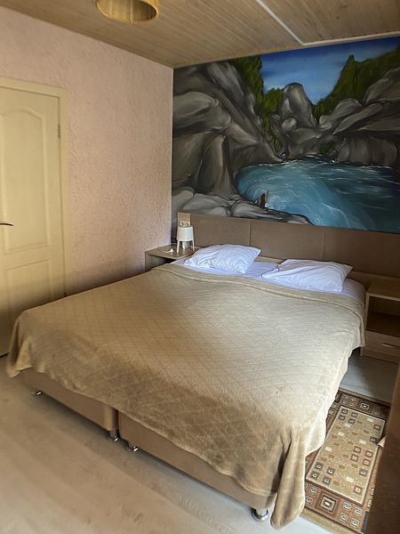 Уютный номер на 2х, категории стандарт. В номере есть: душ/туалет, телевизор, холодильник, чайник, фен, сплит система. 2 односпальных кровати или 1 двуспальная кровать (топер). Выход на индивидуальный балкон с видом на реку.