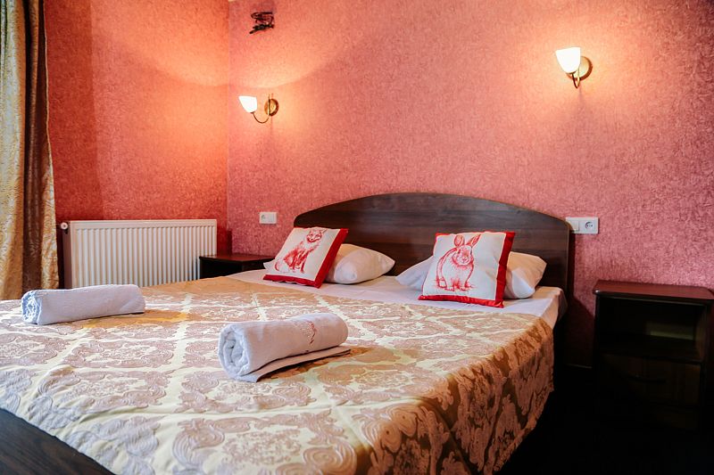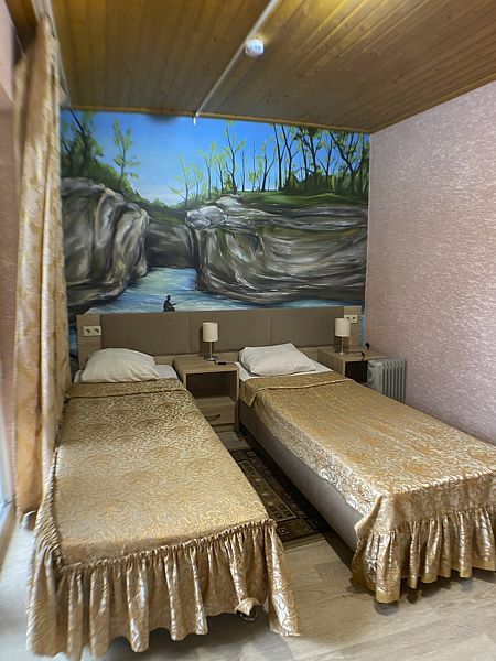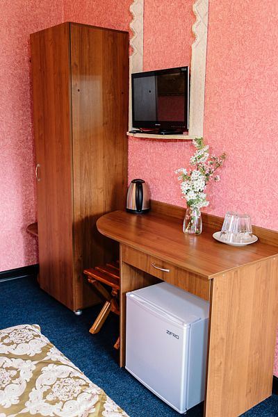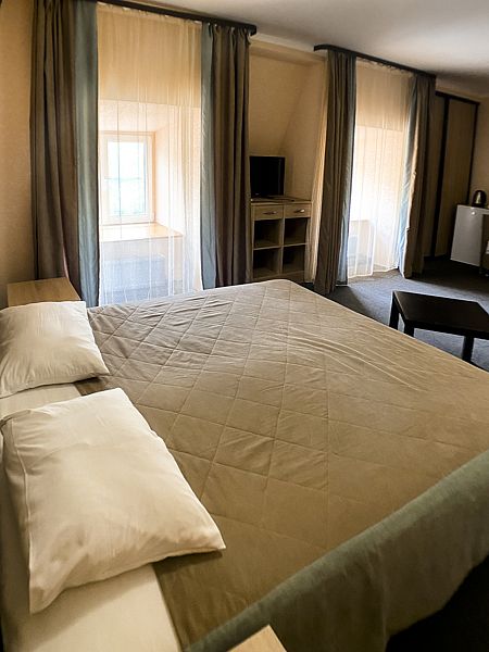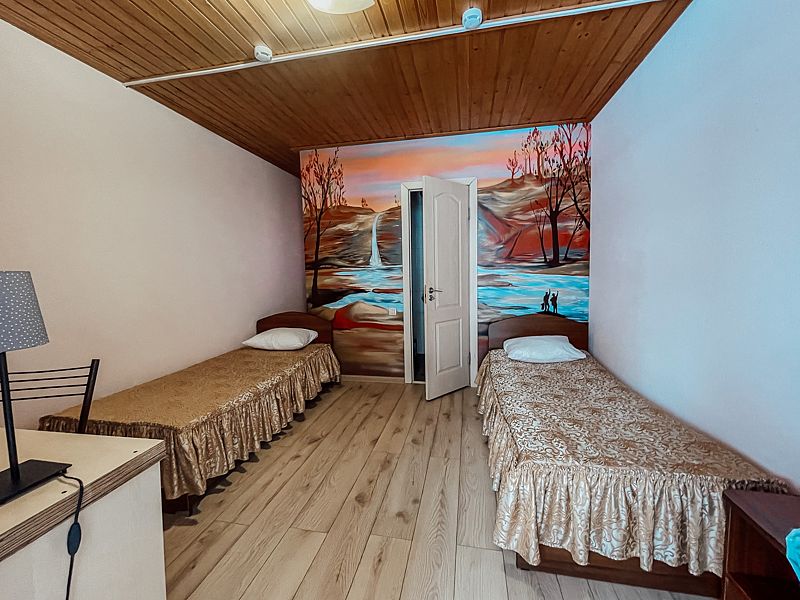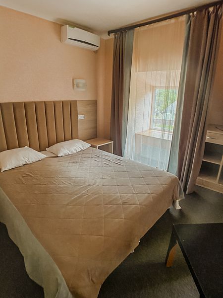 Уютный номер на 2х, категории стандарт. В номере есть: душ/туалет, телевизор, 2 односпальных кровати или 1 двуспальная кровать (топер). Предоставляются душевые, туалетные, постельные принадлежности. Холодильник, чайник, фен, в некоторых номерах сплит система.