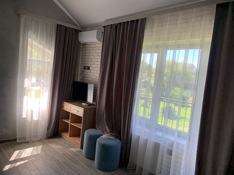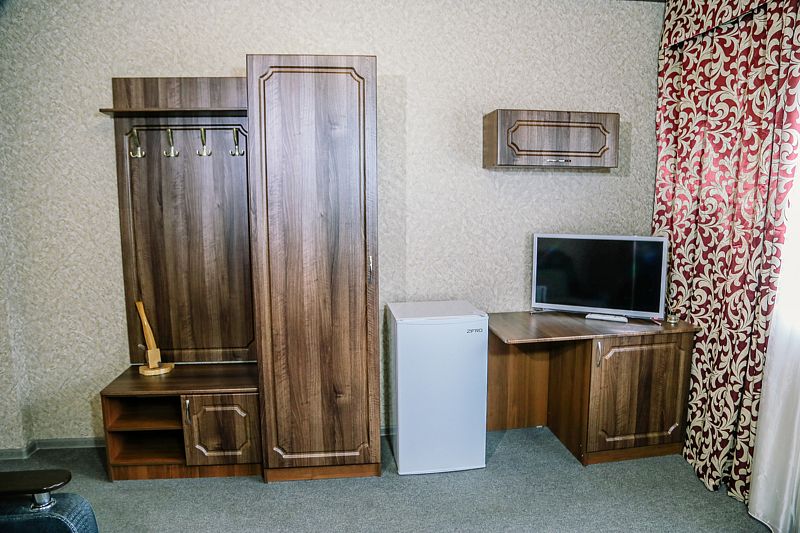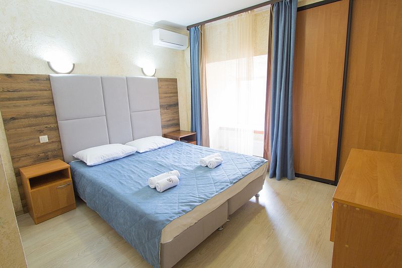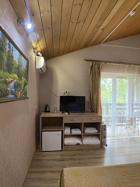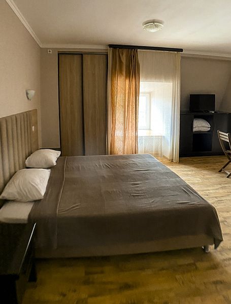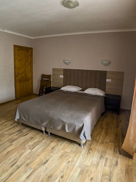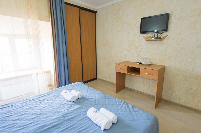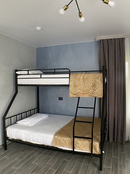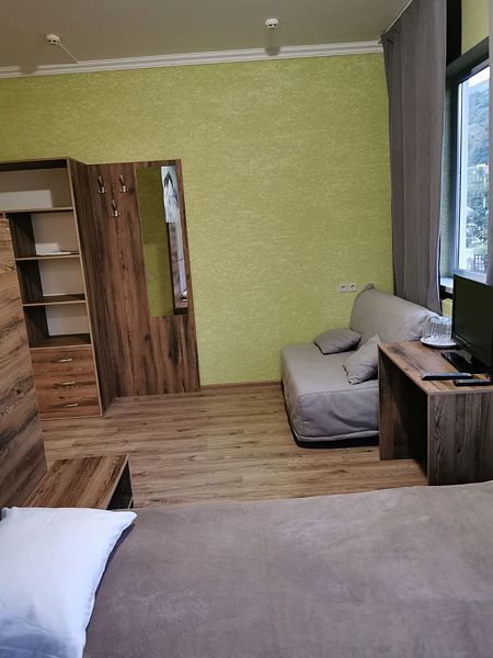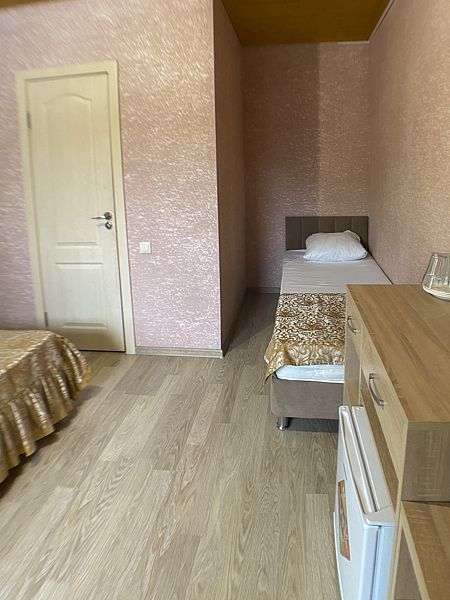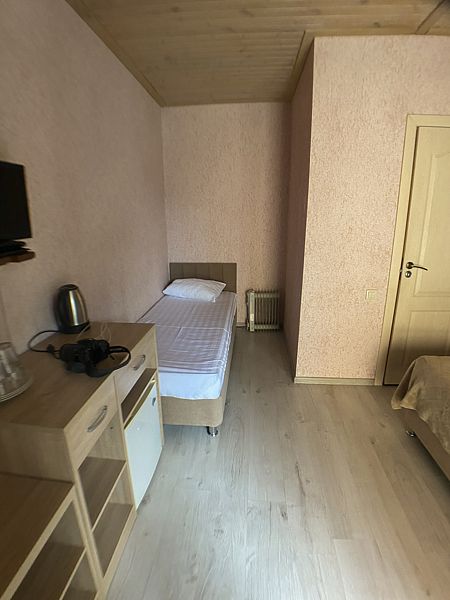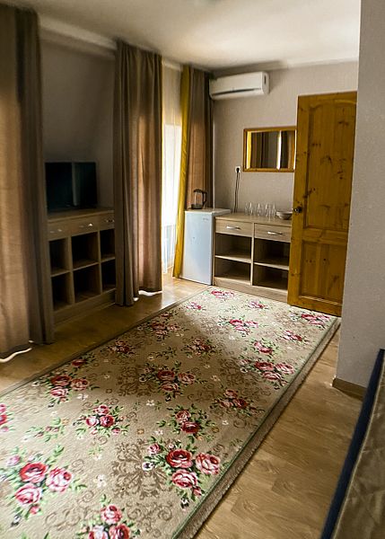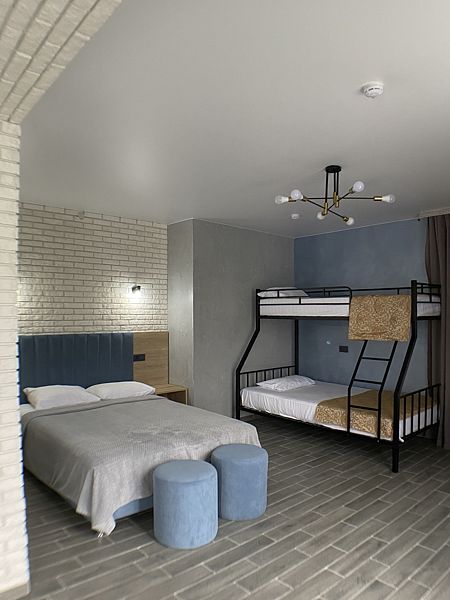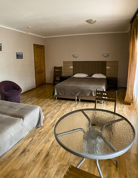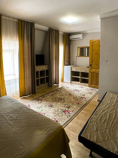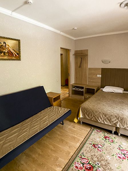 Уютный номер для 3 взрослых и 2 детей, категории стандарт. Располагается номер на 3м этаже. Каждый номер имеет: душ/туалет, телевизор, холодильник, чайник, фен, сплит система. 1 двуспальная кровать, диван раскладной на 2 спальных места и односпальная кровать. Предоставляются душевые, туалетные, постельные принадлежности.