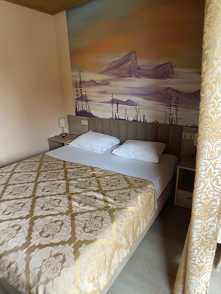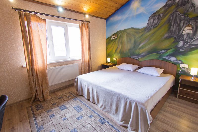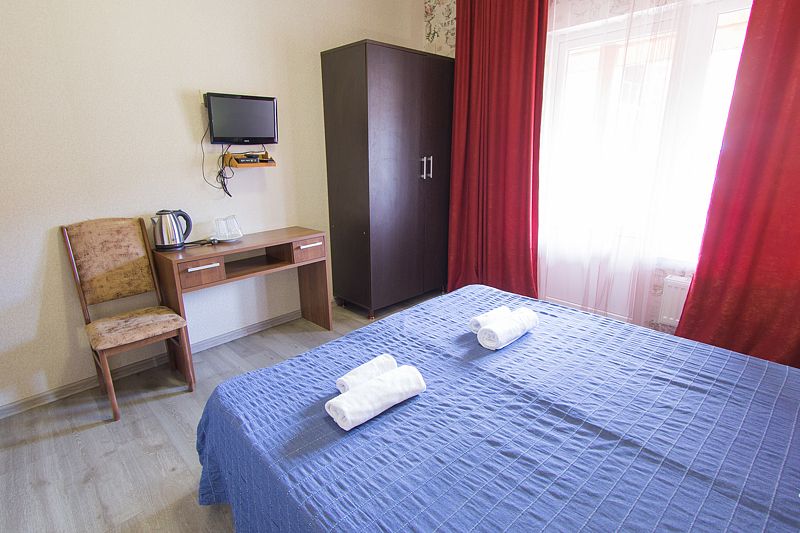 Уютный номер для 2 взрослых и 2 детей, категории стандарт. располагается номер на 2м-3м этажах Каждый номер имеет: душ/туалет, телевизор, холодильник, чайник, фен, сплит система. 1 двуспальная кровать и диван раскладной на 2 спальных места. Предоставляются душевые, туалетные, постельные принадлежности.