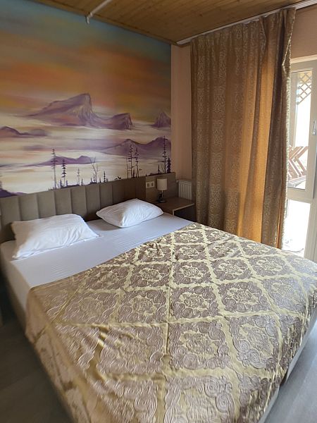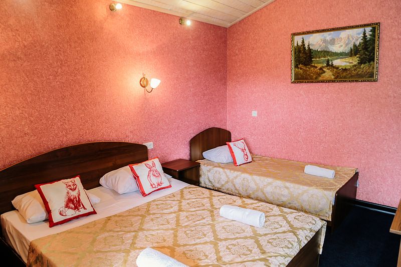 Уютный номер на 3х, категории стандарт. В номере есть: душ/туалет, телевизор, холодильник, чайник, фен, 2 односпальных кровати или 1 двуспальная кровать (топер) и диван раскладной. Предоставляются душевые, туалетные, постельные принадлежности.
