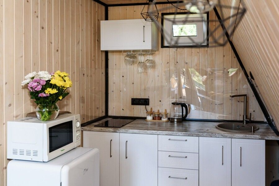 - кухня: электрическая плита, раковина, вся необходимая посуда, столовые приборы, бокалы, холодильник, микроволновка;