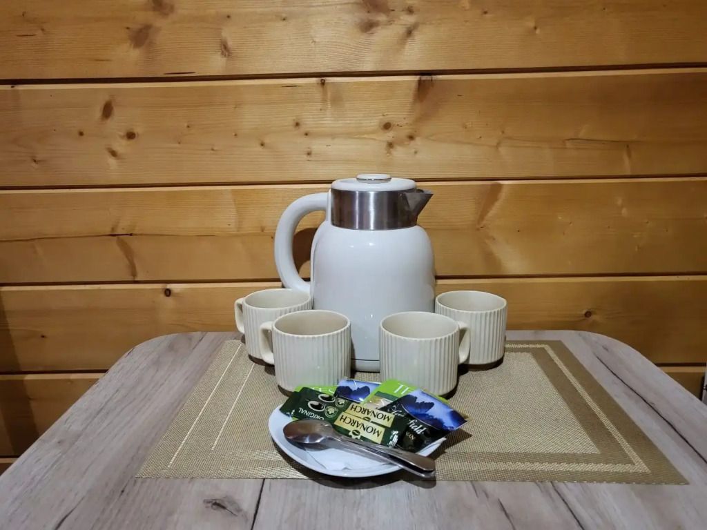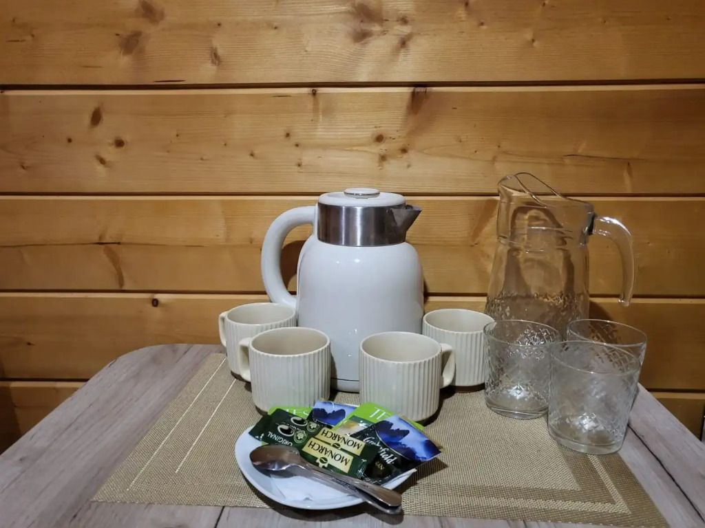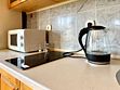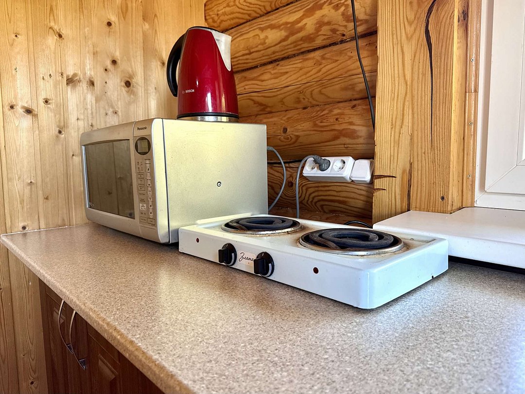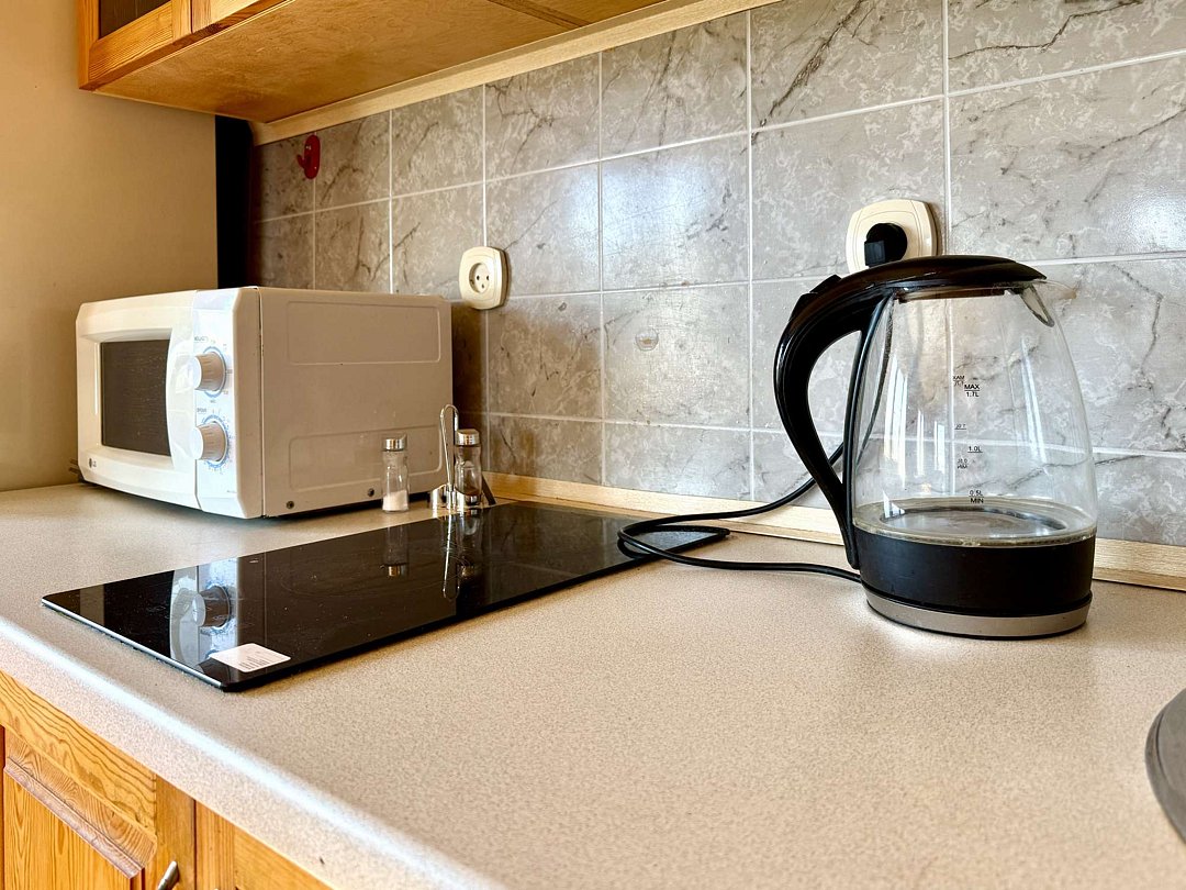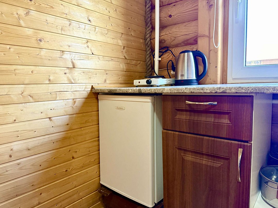 - оборудованная кухонная зона: электрочайник, холодильник, электро плита, посуда и кухонные принадлежности,