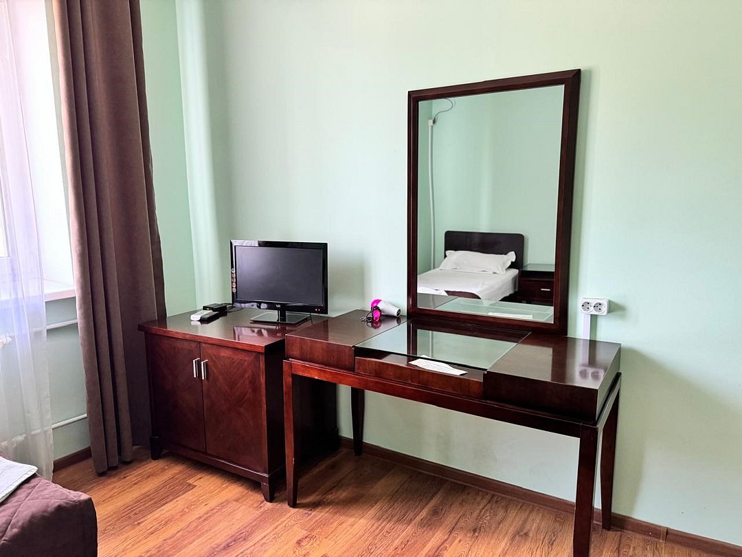 Wi-Fi, светильник, фен, обогреватель, ванная комната, душевая кабина, санузел, банные принадлежности, банные полотенца, тапочки, двуспальная кровать, две односпальные кровати, гладильная доска, тумбы, стулья, вешалки, письменный стол, зеркало, обслуживание номеров, сейф, унитаз, раковина, питьевая вода, отопление, вид во двор, ламинат, стаканы, туалетные средства, сплит-система, цифровое тв, телевизор с плоским экраном, мини-холодильник, москитная сетка, вид на горы, номер для некурящихВ номере