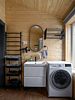 Санузел вместил в себя душевую кабину, безободковый унитаз, раковину, стиральную машину с функциями пара, гипоаллергенной стирки и сушки, а также электрический полотенцесушитель и раздвижные сушилки.