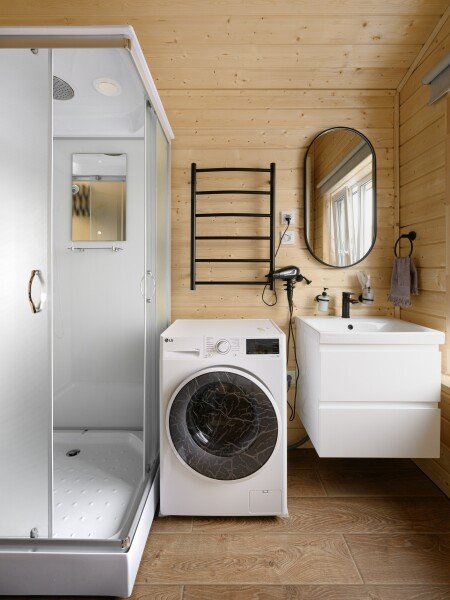 Санузел вместил в себя душевую кабину, безободковый унитаз, раковину, стиральную машину с функциями пара, гипоаллергенной стирки и сушки, а также электрический полотенцесушитель и раздвижные сушилки