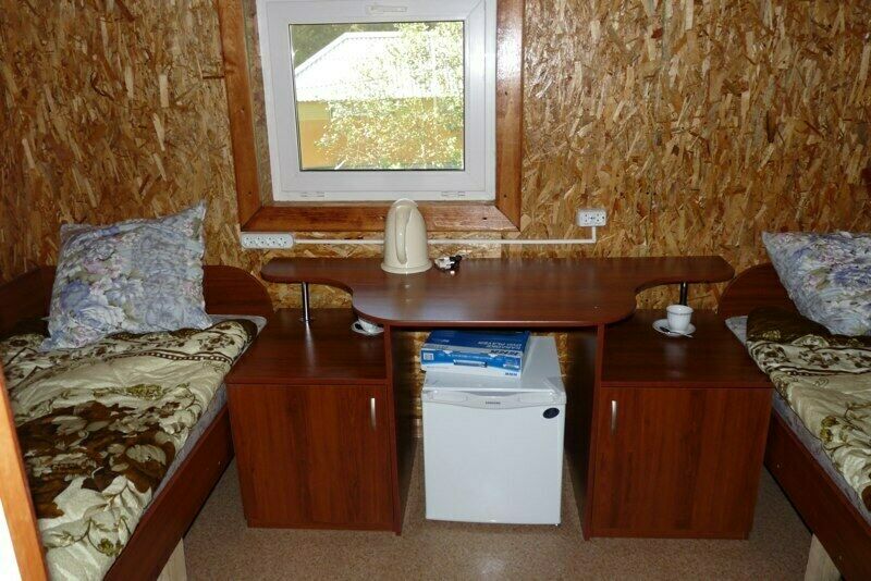 Комплектация каждого номера: кровати, столик, стулья, шкаф, зеркало, холодильник. Санузел находится в нескольких метрах от корпуса: благоустроенные туалеты и душевые, холодное и горячее водоснабжение.