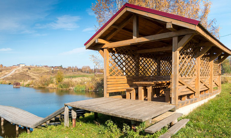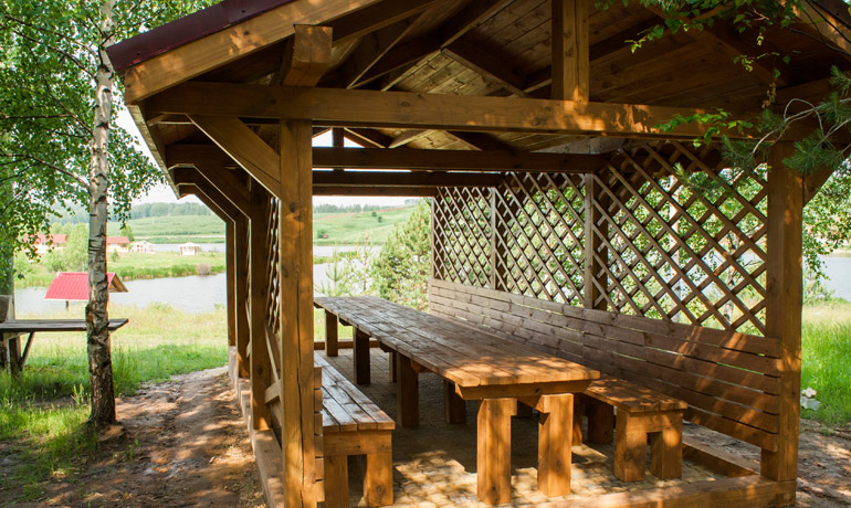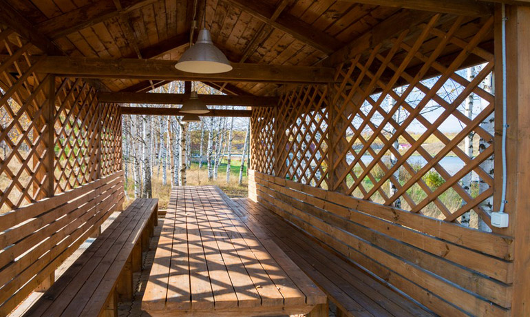 - Большие деревянные беседки с очагом и мангалом на берегу озера вместимостью до 20 человек.