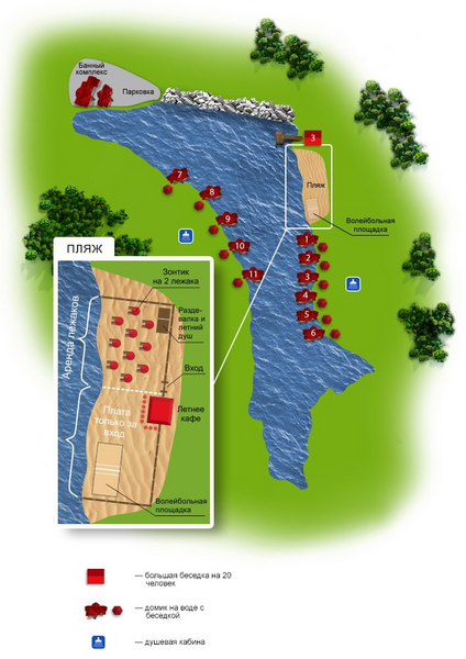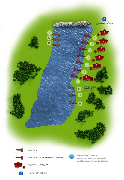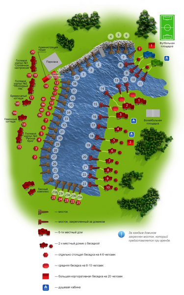 Все озера клуба оборудованы уютными беседками. Малые рассчитаны на 4-6 человек, большие корпоративные вмещают до 20 гостей. Все беседки оснащены мангалами, местами для костров и сдаются на день.