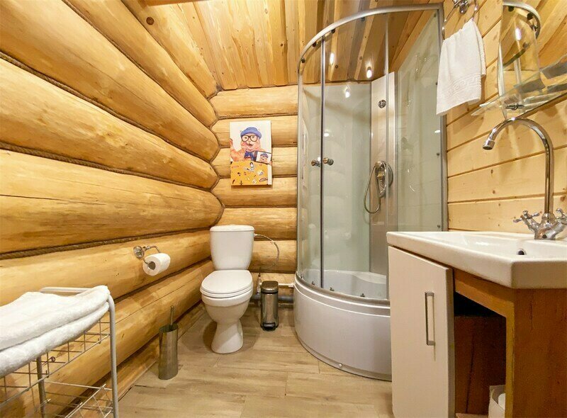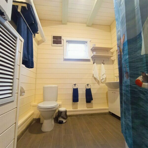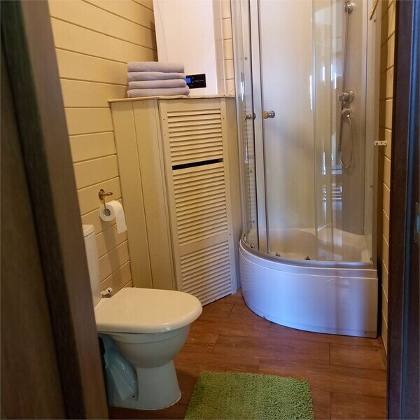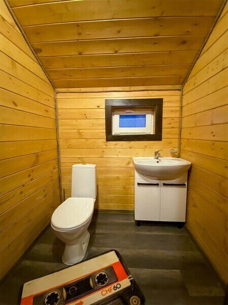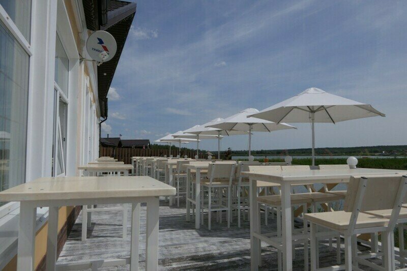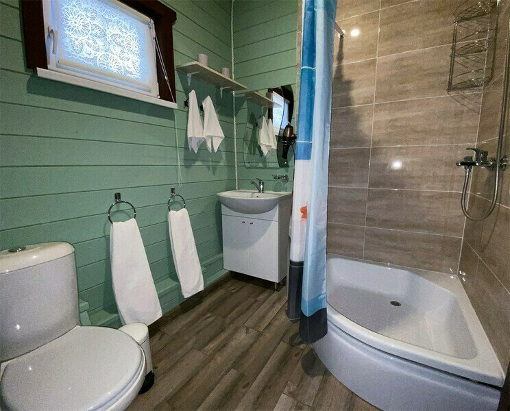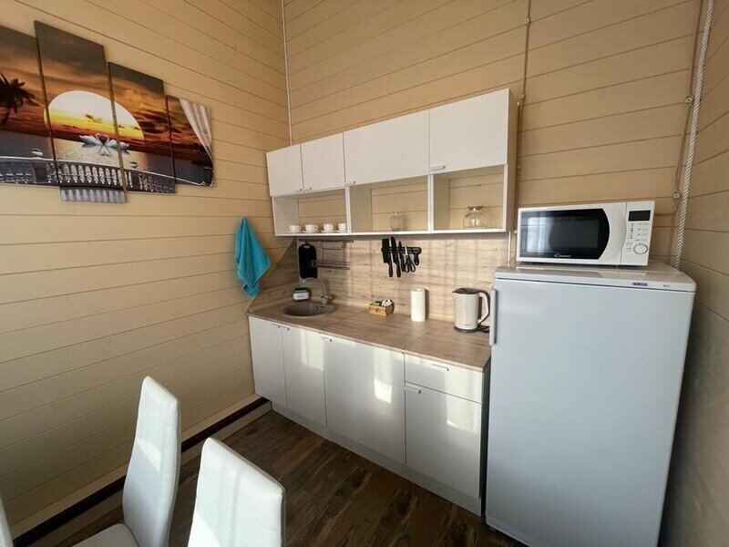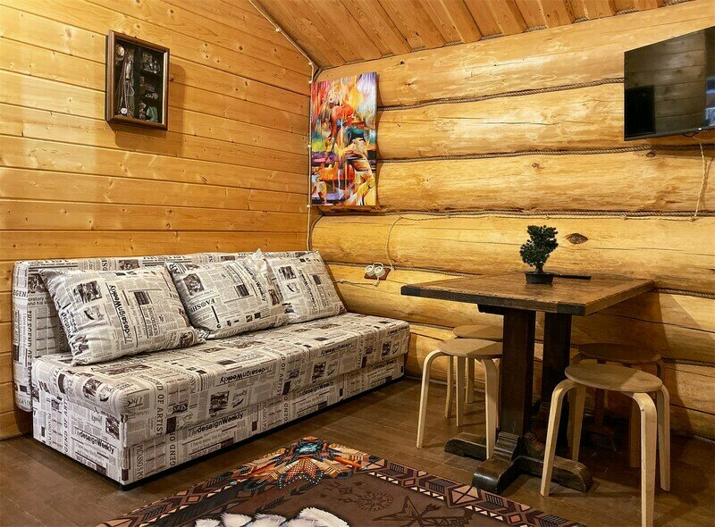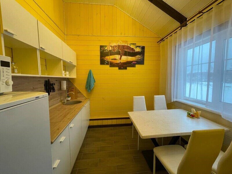 Жаркая парная с ароматом можжевелового панно, уютная комната отдыха с обеденным столом и оборудованной кухней (холодильник, микроволновая печь, набор посуды, чайник); панорамный вид; веранда и спуск к озеру; Wi-Fi.