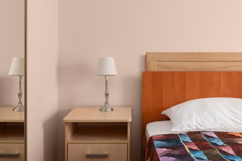 Небольшой уютный номер с двумя раздельными кроватями оформлен в приятной нежно-розовой гамме.