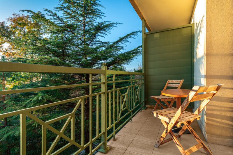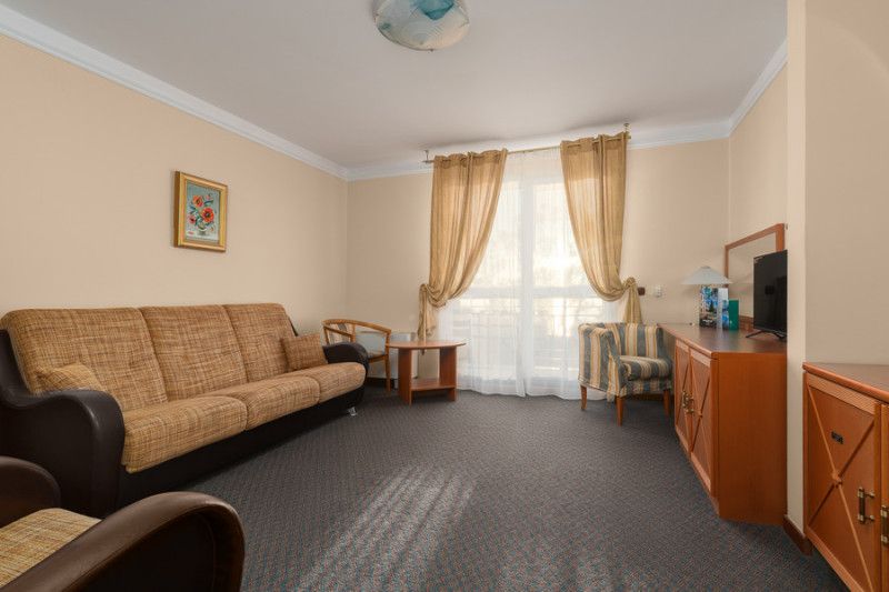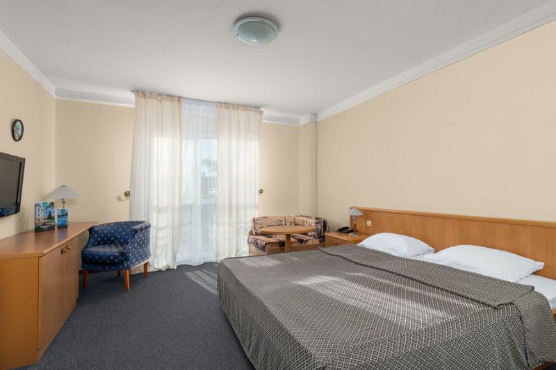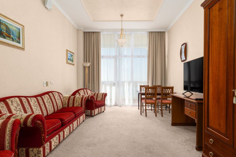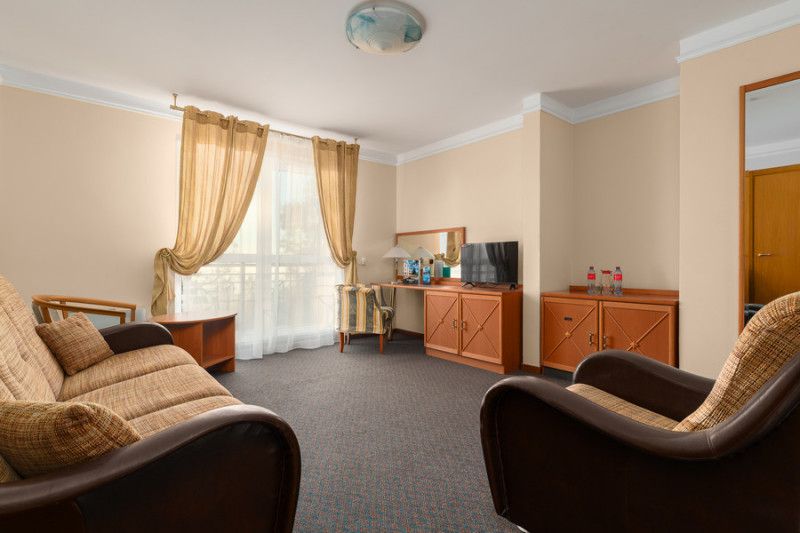Номер с балконом состоит из спальни с двуспальной кроватью, гостиной с удобным раскладным диваном и ванной комнаты. Вид на территорию.