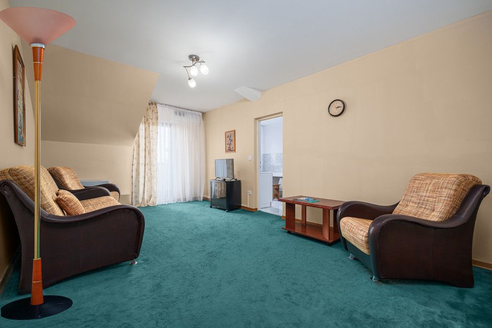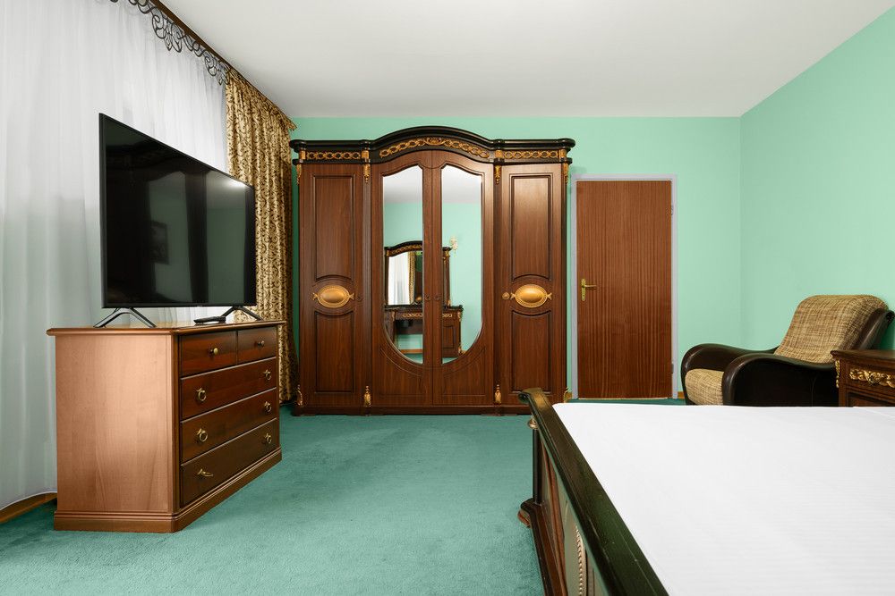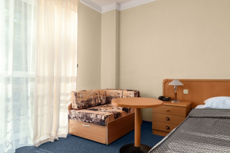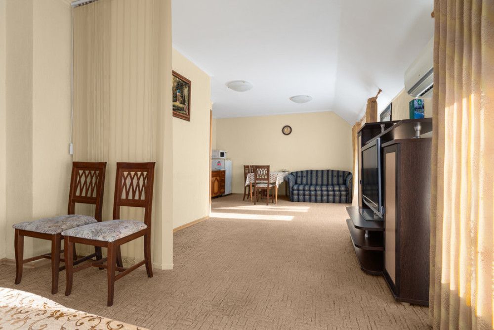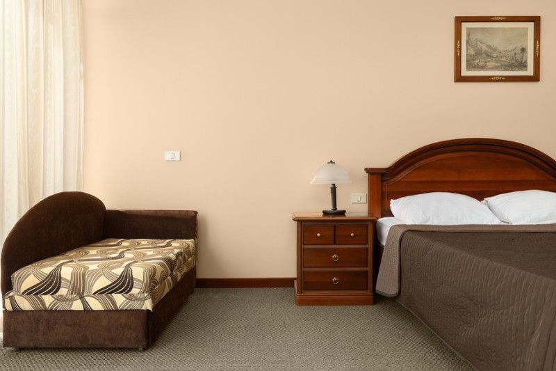 Большой комфортабельный номер с двуспальной кроватью и двухместным раскладным диваном оформлен в приятной светлой цветовой гамме и оборудован всем необходимым для комфортного отдыха в атмосфере домашнего уюта.