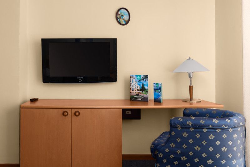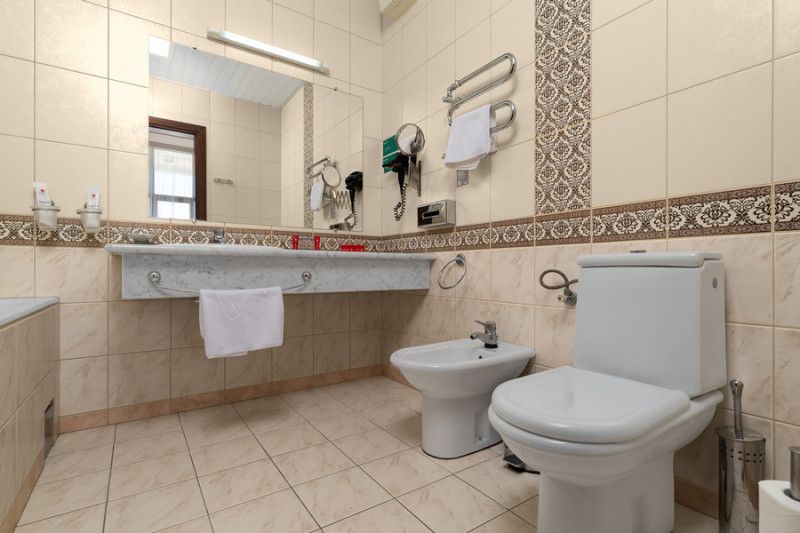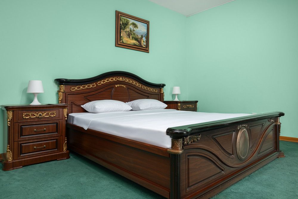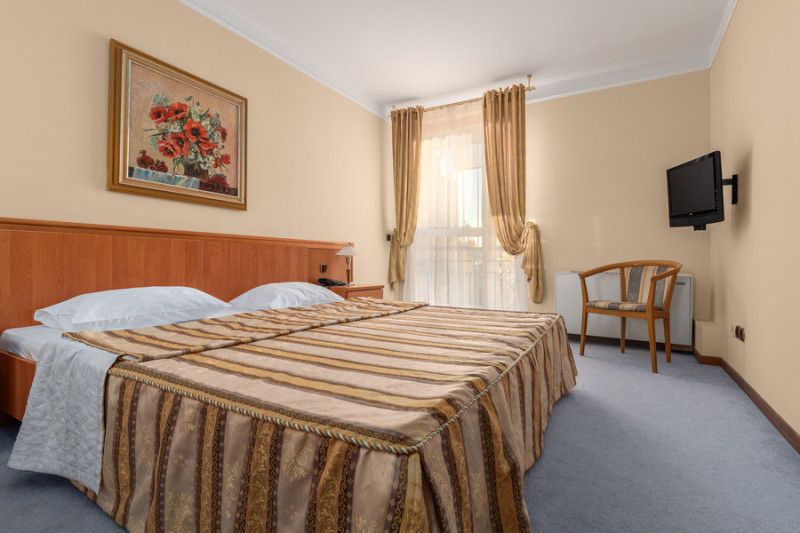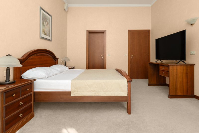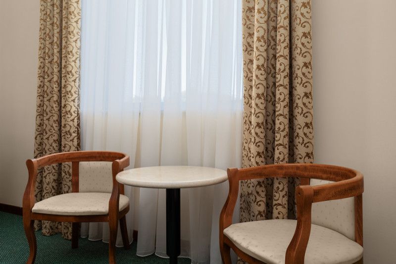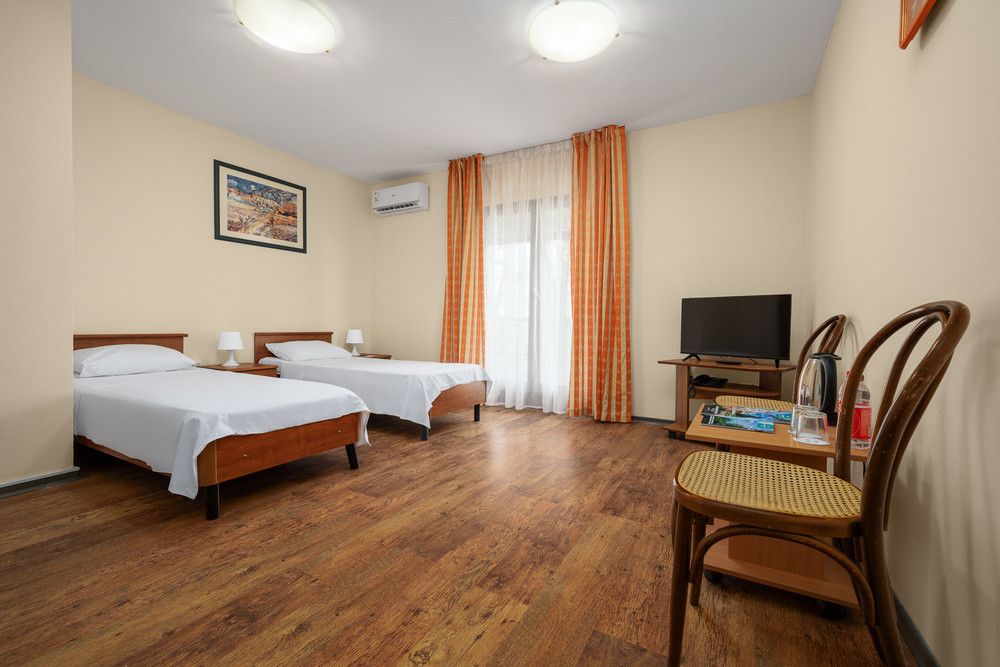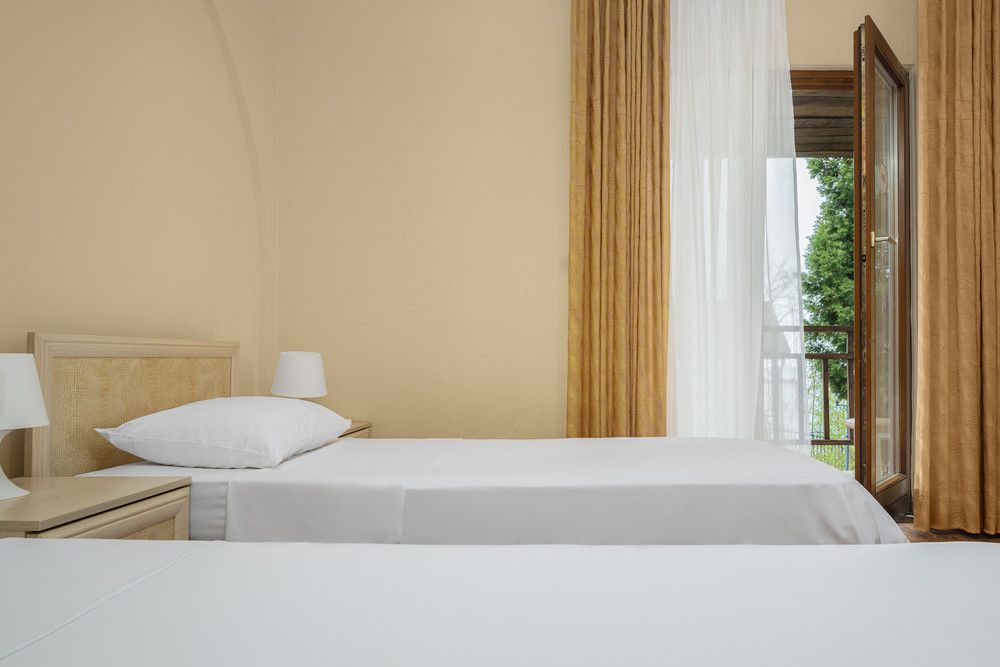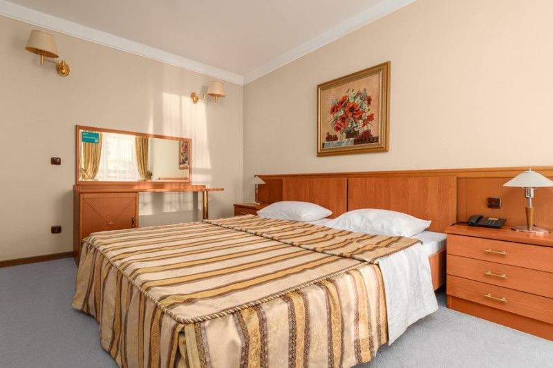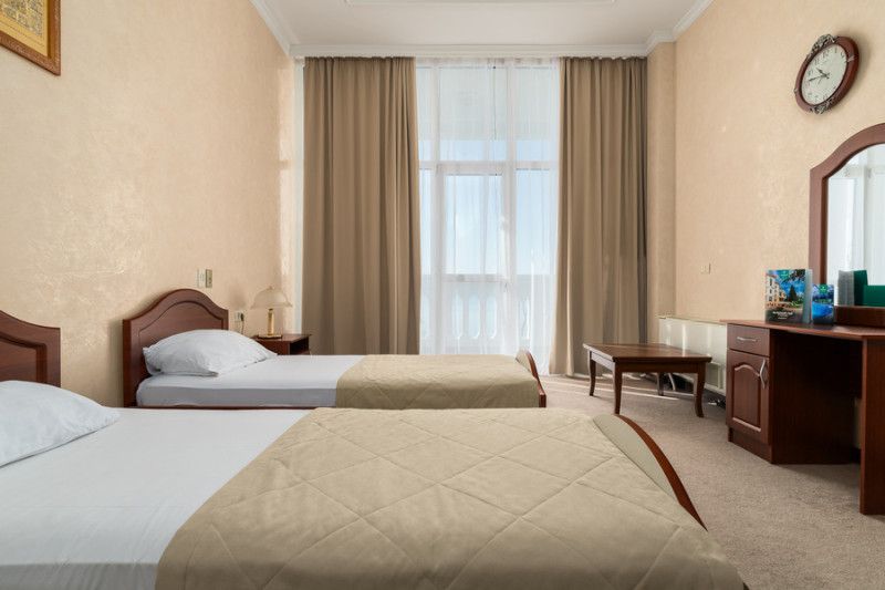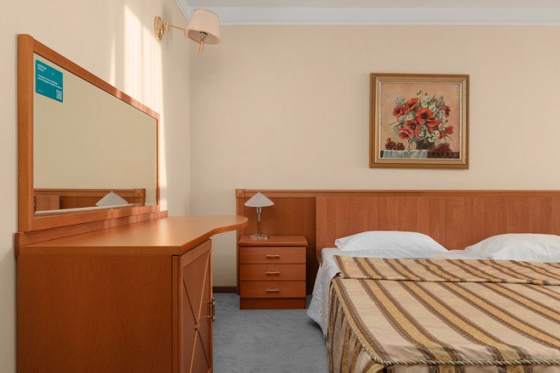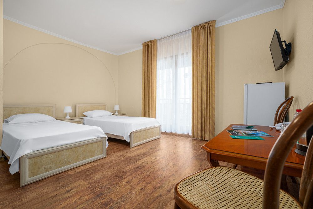 Просторный светлый номер с двумя раздельными или одной двуспальной кроватью оформлен в классическом стиле и располагает к приятному отдыху в атмосфере домашнего уюта.