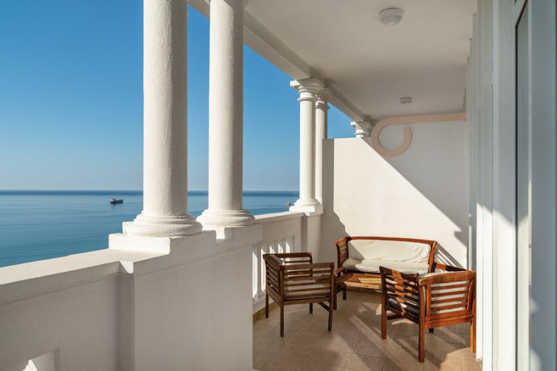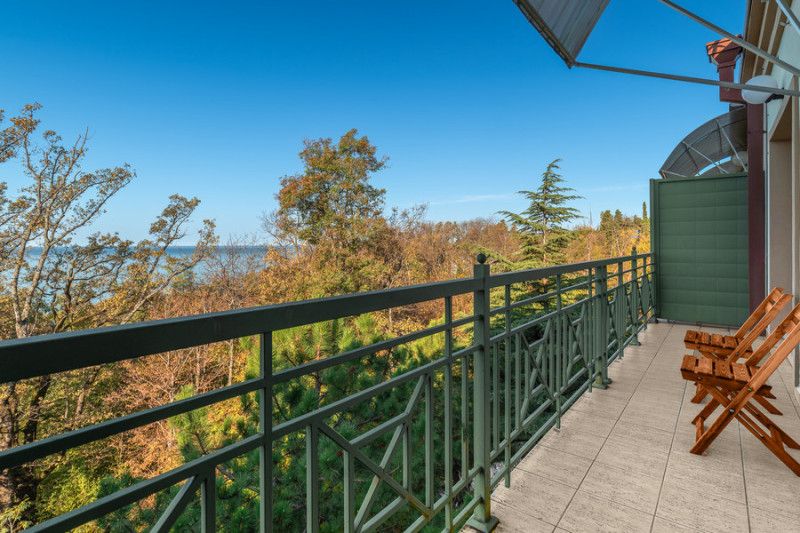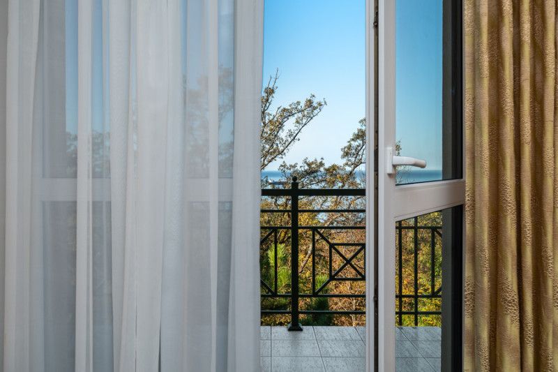 В гостиной расположен диван, в спальной комнате двуспальная кровать. Номер рассчитан на комфортное размещение 2-4 гостей. Панорамный вид на море.